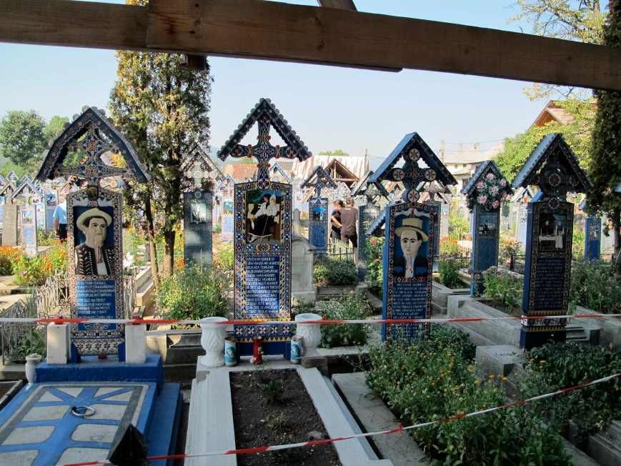 We bought lunch at the swish supermarket in Sighetu Marmatiei (‘siget’ to its intimates). I have an undistinguished but otherwise interesting photo of the main street which shows that in Sighetu there is a bistro called the Eldorado, a branch of Western Union and a shop that has ‘Orice produs 3 lei’, ‘All products 82.7 Australian cents’ which provides a rough idea of the exchange rate. We drove on to Săpânţa where I, at least, got a surprise — the very Merry Cemetery.