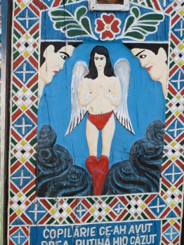 Stan Ioan Pătraş began carving these headpieces in 1935 and now there are more than 800 of them. As well as their good humour one of their distinctive features is their honesty. An 18 year old boy loved his car too much and was killed driving it. Despite her angelic nature, one woman had two gentlemen friends. And one rather grisly one talks about how the ‘bastard Hungarians’ shot the subject in the back and decapitated his friend while they were out hunting. (In nearby Harghita province more than 80 percent of the population describe themselves as Hungarian.)