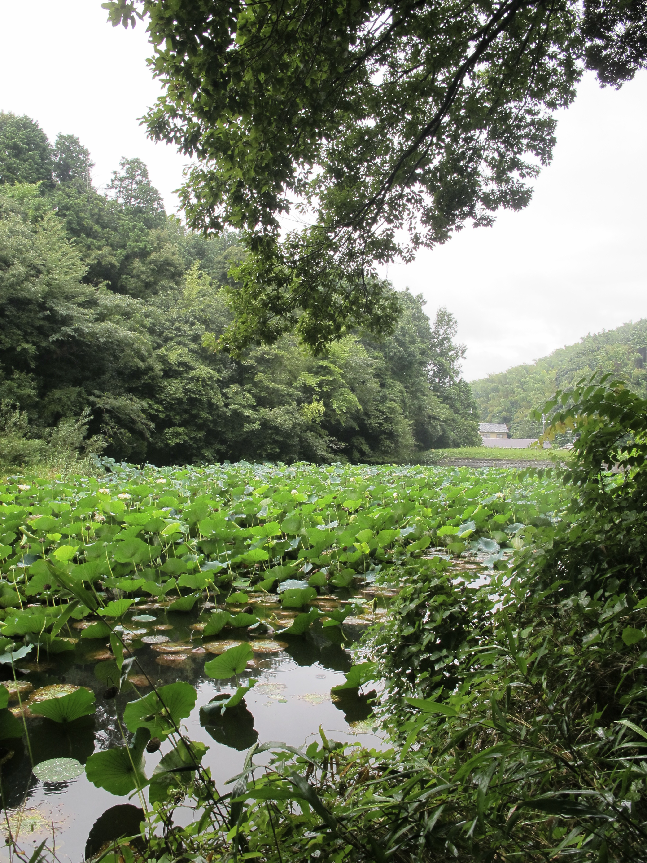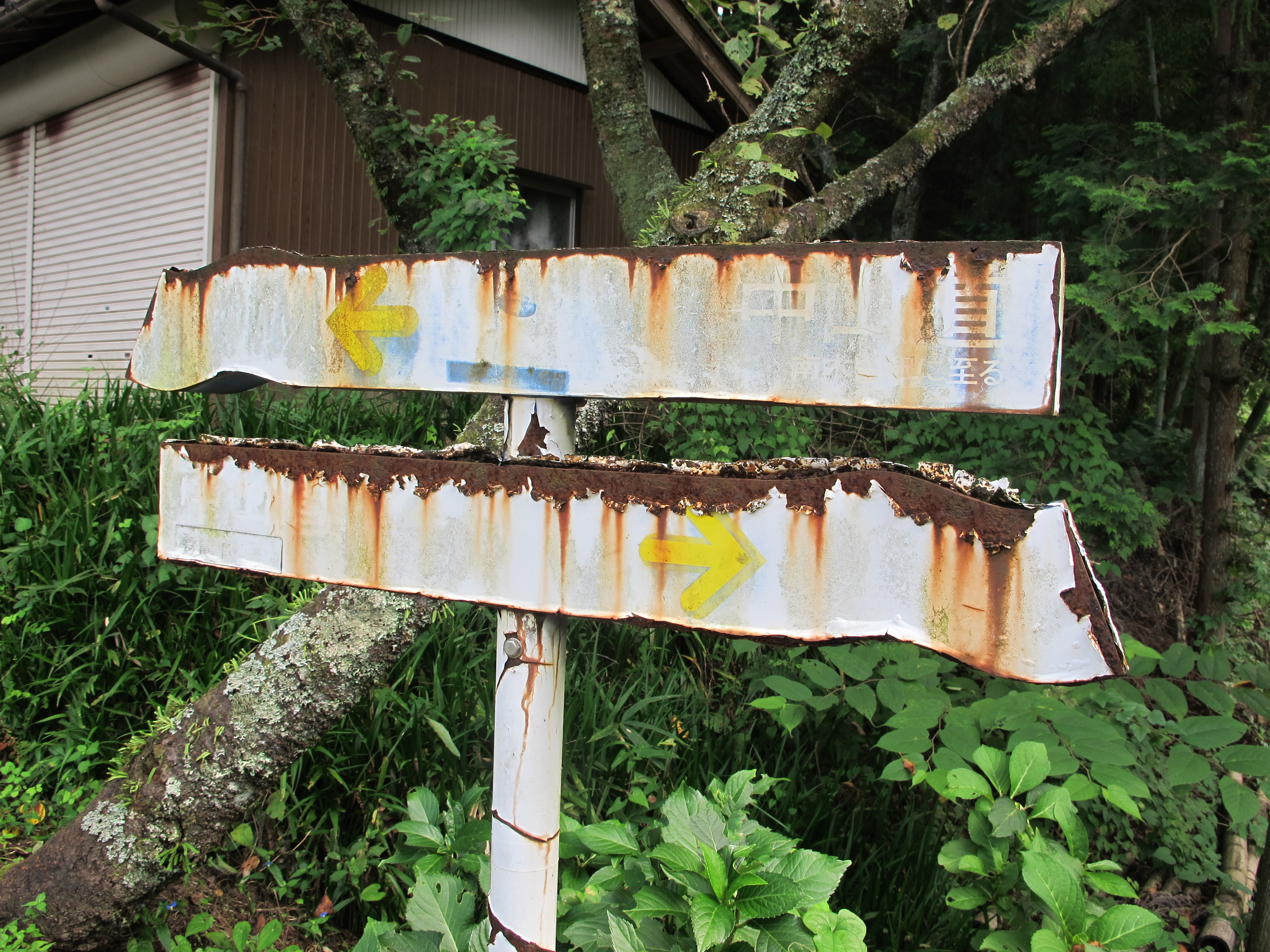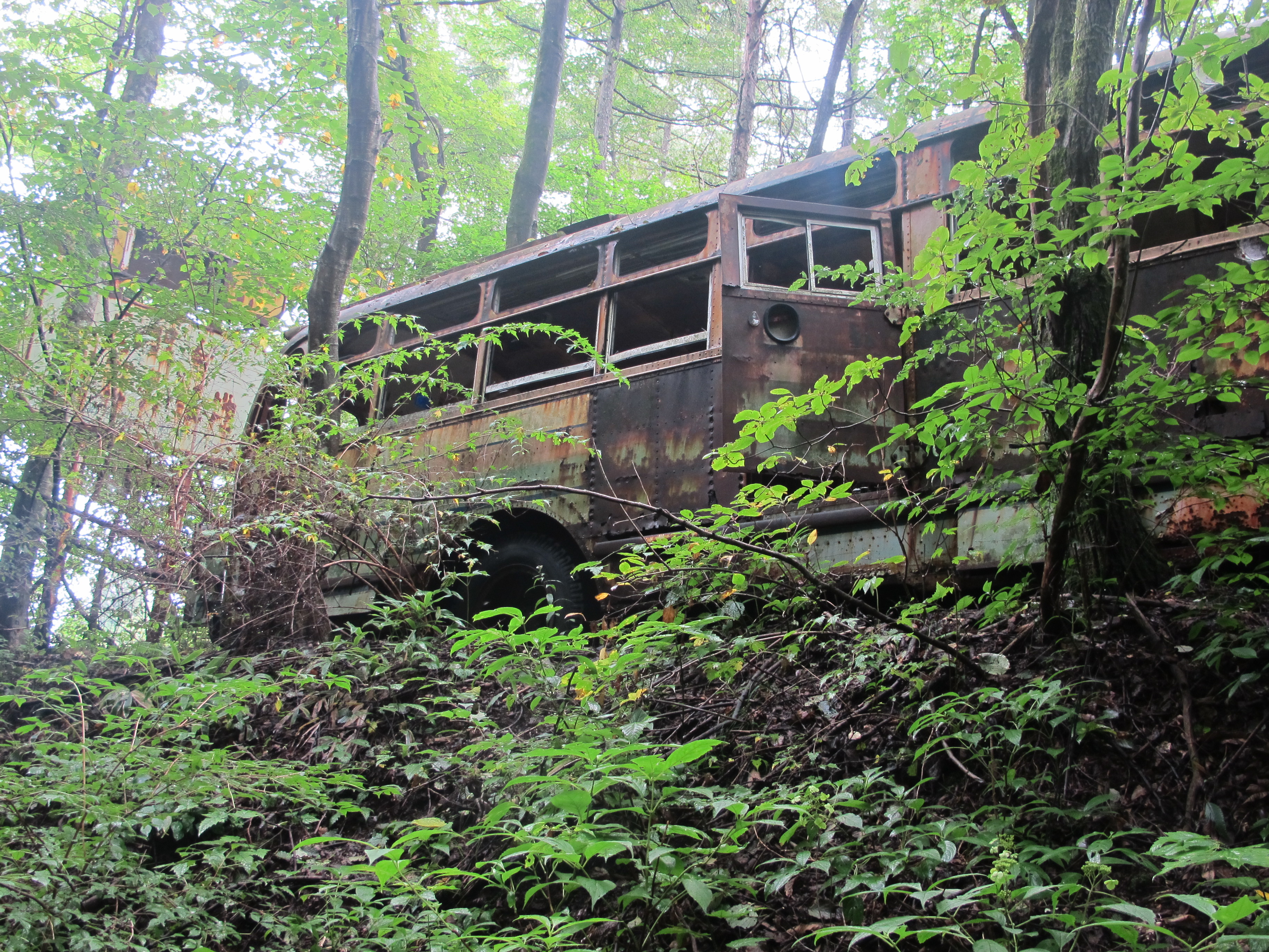 Yep. It’s a bus. Abandoned. Next to a school. Not too small, maybe five classrooms. Abandoned. Near three small houses and a tea house right on the route. Abandoned. It was quite eerie, as un-Japanese as the cheese shops of Kuruizawa. We stopped for lunch shortly after but were driven down hill by the mosquitoes and — new thing, but how correct in context — leeches. So we stood on the side of the road disrobing and picking them off much to the interest of passing motorists.