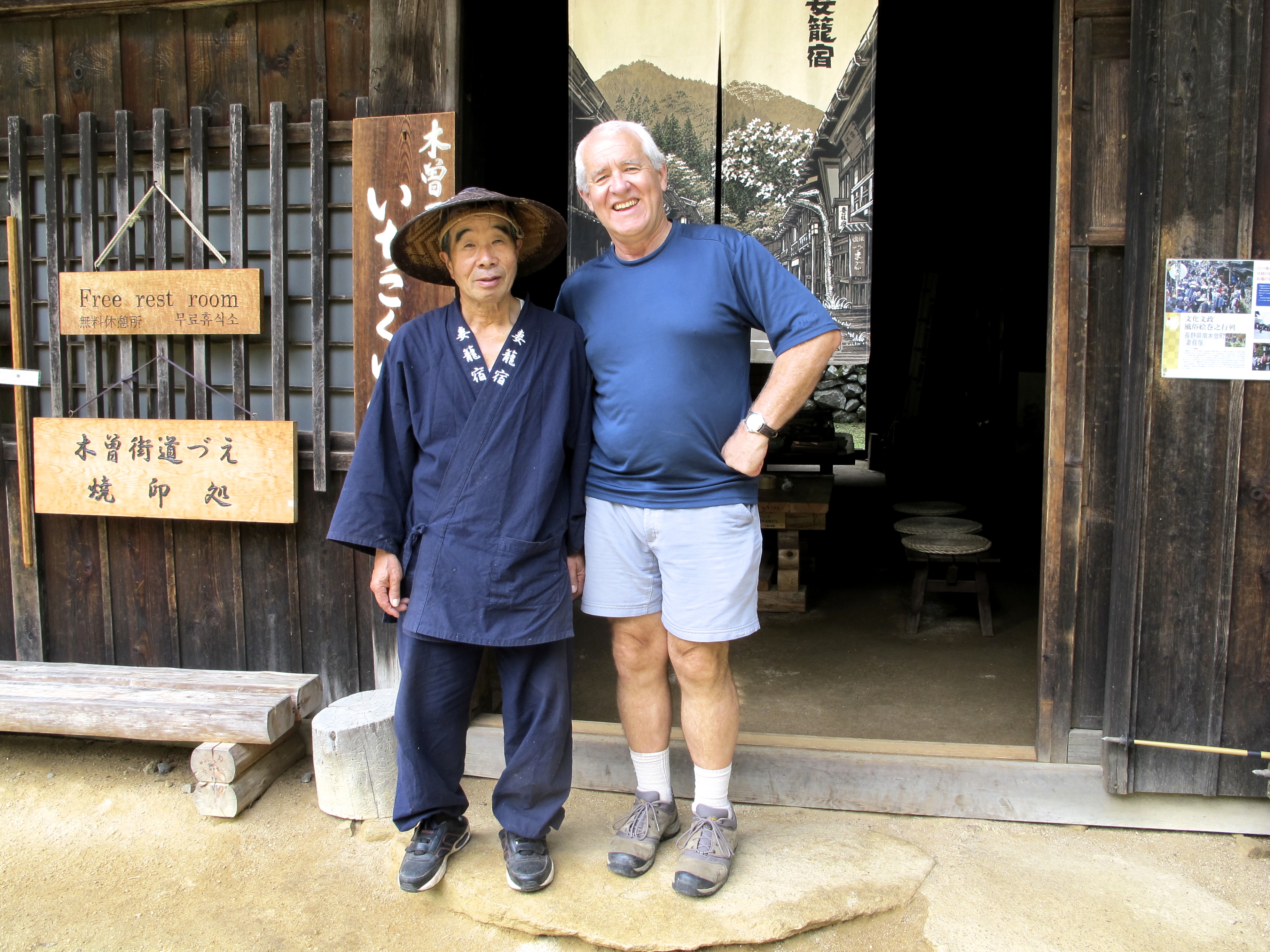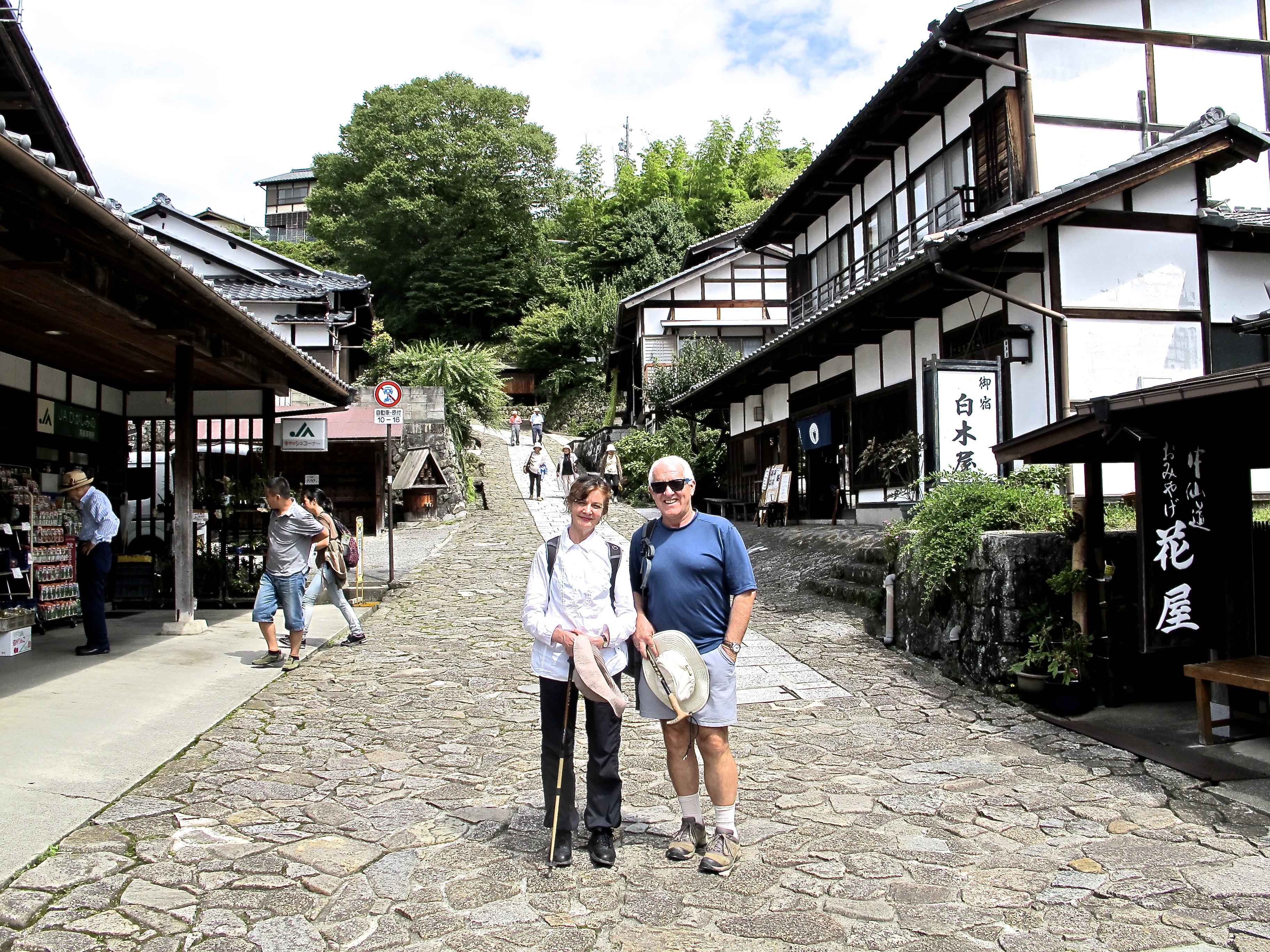 is a path very well travelled, about 9 k.s with a bit of a climb up to a pass cunningly named Toge (‘pass’). Magome is a well-patronised tourist town with a lovely view over to a range of mountains topped by Mt Ena at nearly 2200m. You could happily spend an hour or two there. But we were ready to get going. And look at us (in the main drag of Magome) — clearly ready for anything.