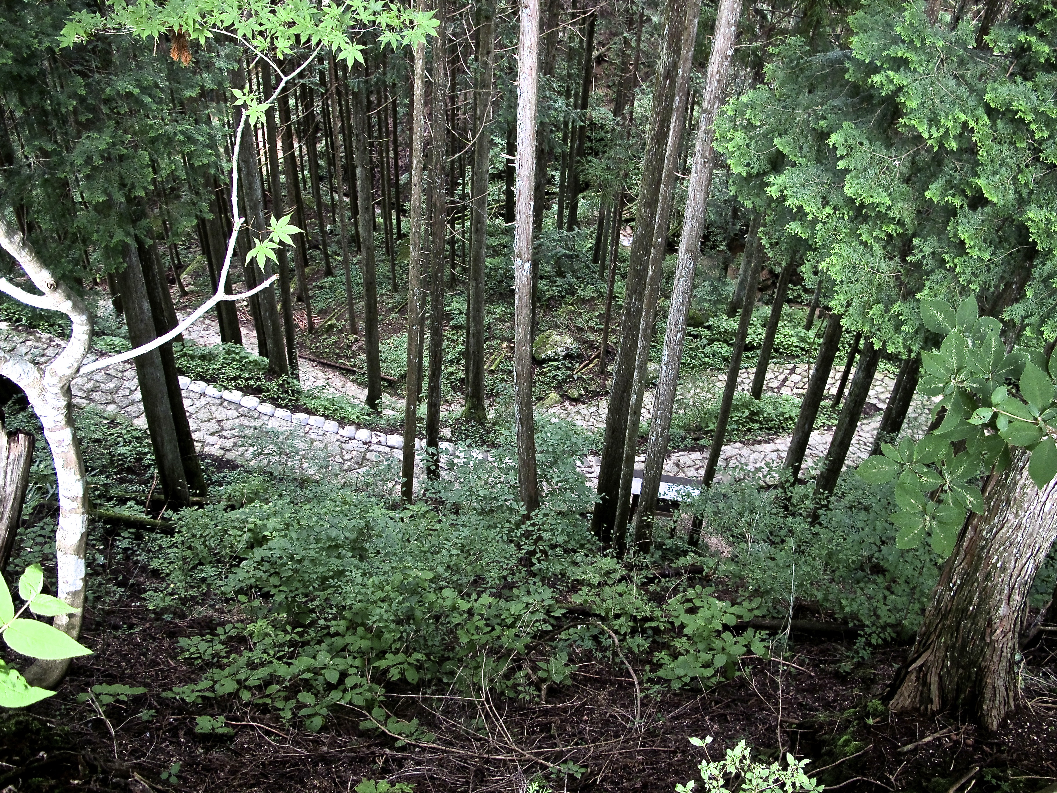 For a third of this section of the walk you are following the top of a complex ridge line and that’s the meat of it really. You are rarely head out of the forest — nothing to see here, just the tangled and often unlikely forms of the forest. If this blog wasn’t so long I would include a photo here of a 50 metre tree growing almost horizontally across a gully. There were fine topographical opportunities for banditry, for example, the track narrowing to two or three metres with large cliff falls either side. The occasional outcrops of rock would hide the mountain bandits, the sanzoku.