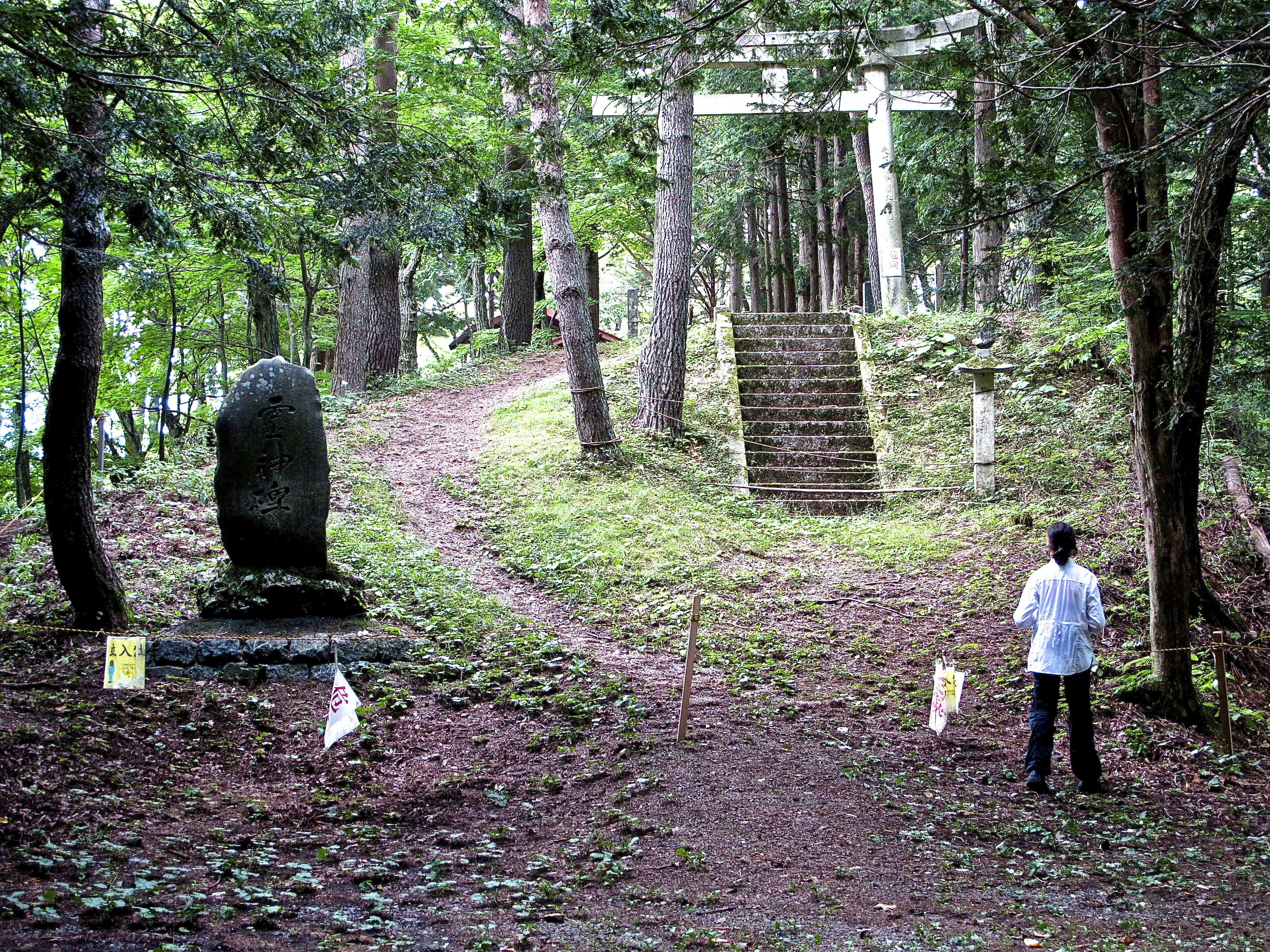 ‘One of the hardest parts of the Nakasendo’? No, not really. We went back into town after a leisurely morning (‘Fukushima in the region of Kiso’ for those who are thinking about that name in other sadder contexts) and caught the train to go further up the valley to Yabuhara from there climbing over the Torii-toge, the ‘gate pass’ mentioned in ‘Orange‘. It is at 1200 metres but you start a bit under 900, and it just seemed to go easily. Nicely graded track, well-signposted, everything in the right place. We had lunch, a more successful lunch, on the pass and found the torii. I think but I’m not sure that this is pretty close to the exact half way mark of the whole Trail.