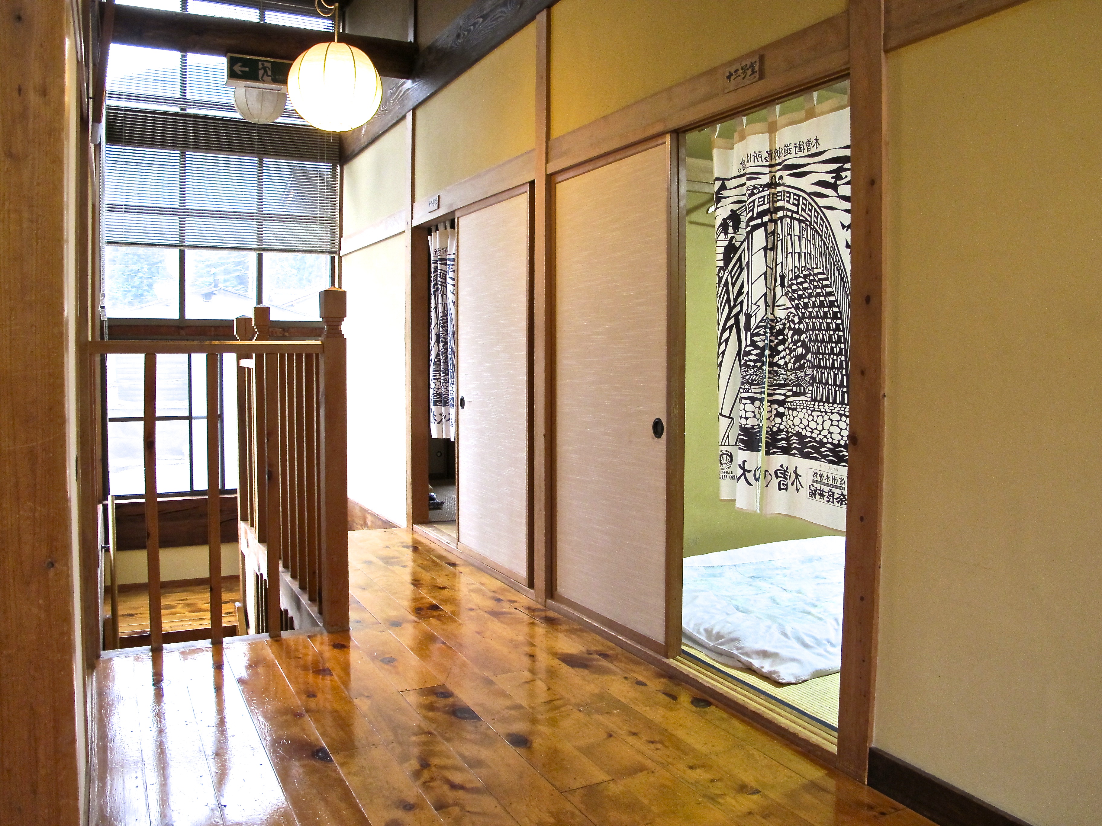 Our views about Narai were coloured by three things on arrival: a nice little museum devoted to folk arts and Narai history with a very friendly and helpful staffer; a series of gorgeous unobtrusive shrines set back into the forest wall; and a shop which had beautiful things we wanted to buy. It was a tourist town too, but I think not on the mainstream track. Good coffee, friendly people, interesting shops and a ryokan, quite Spartan, which we really liked. The entry to our room.