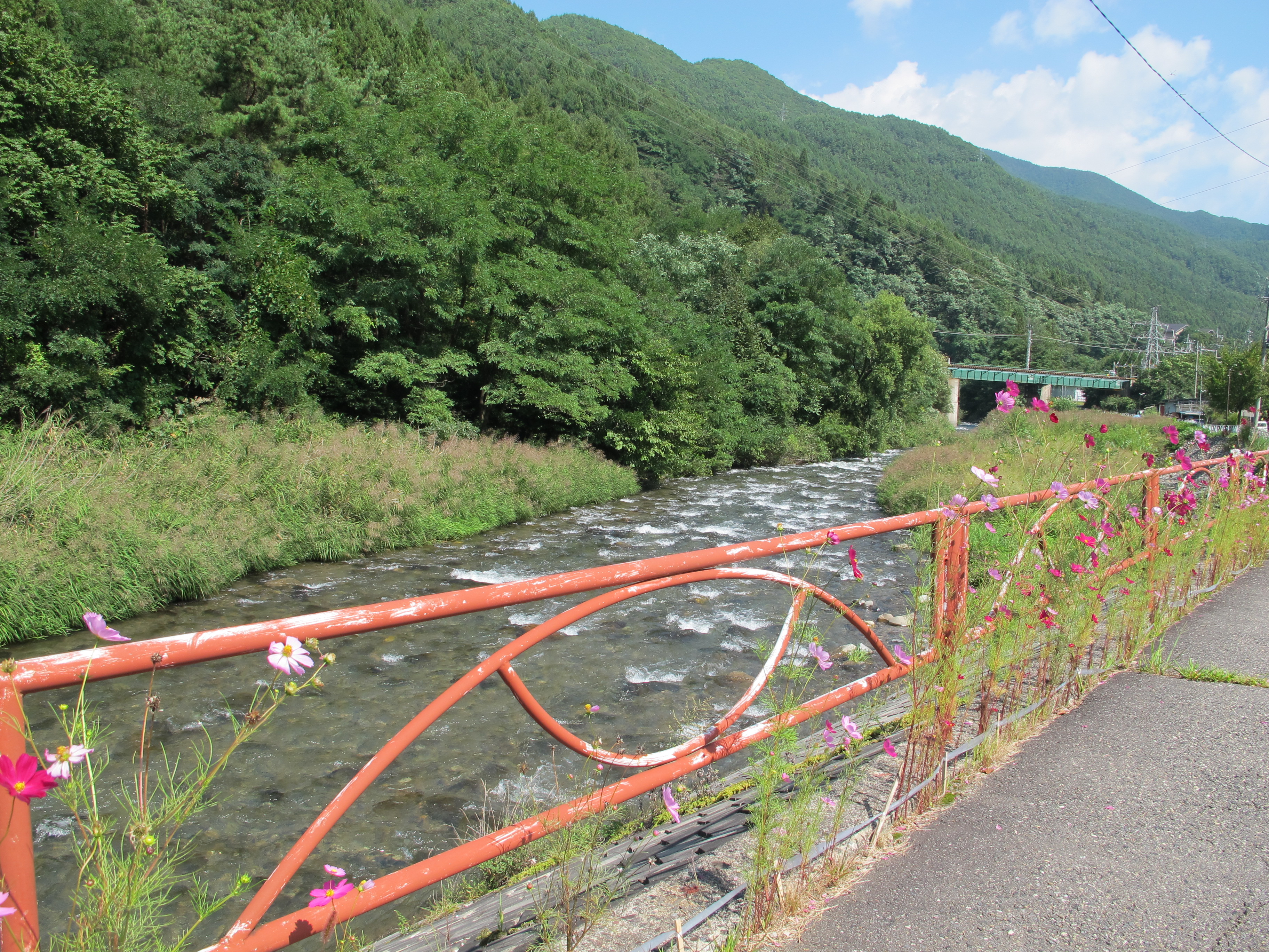 The first stop was Nagiso to get some lunch. It was relatively early and I made the wrong choice about how to get across some railway lines to the shop and we noodled round there a bit. What did we buy? Two fantastic looking peaches that turned out to be rotten, some first grade monster apples, some Pocky (chocolate covered pretzel sticks for someone who likes such things), some shocking doughnut-like substances in individual cellophane wrappers. Mmm bad buying, but I think the best we could have done in the circumstances.