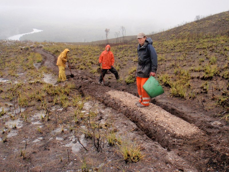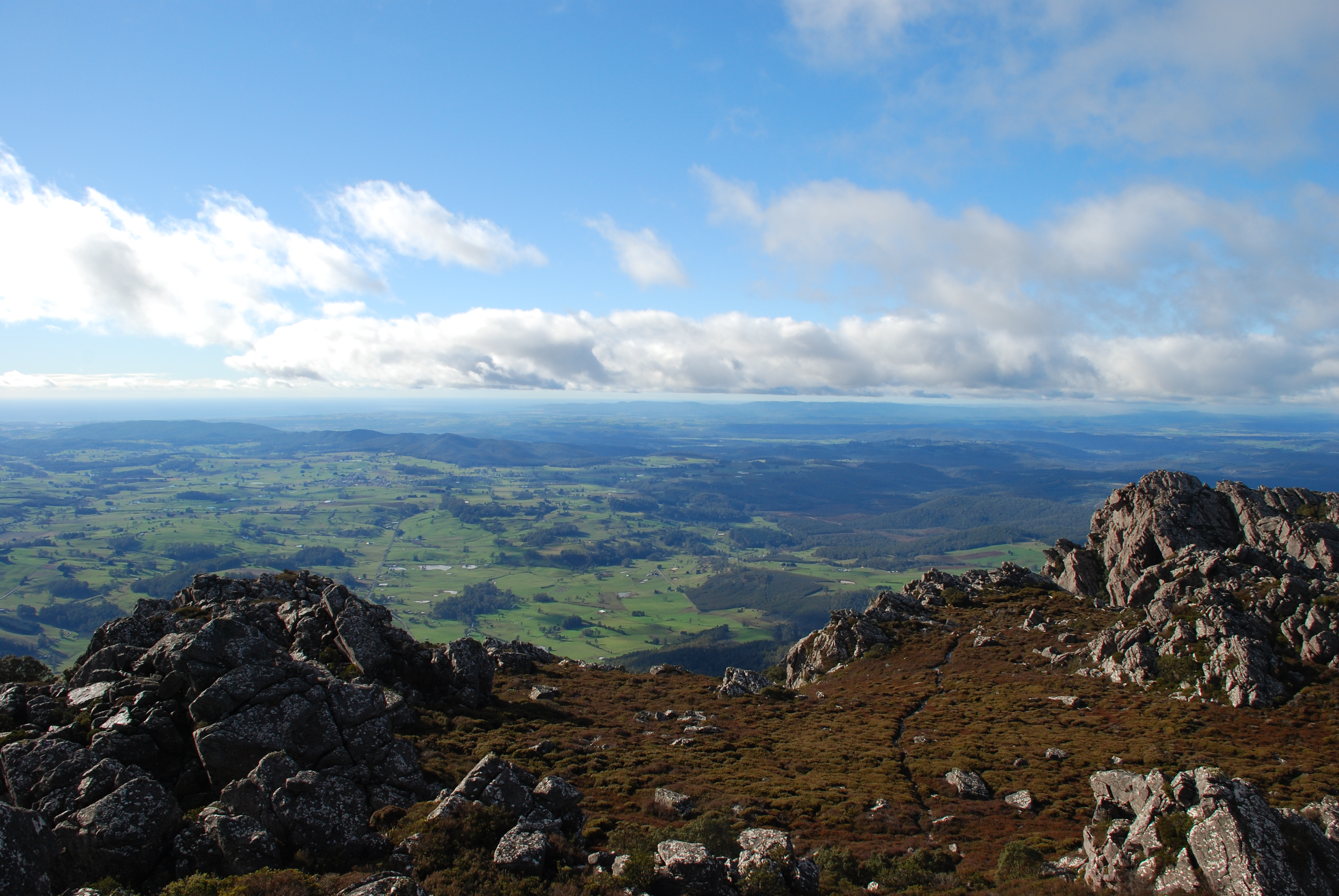 But the next day the weather turned. It was clear, mild and sunny and we climbed Mt Donaldson, a genial 500 metre rump with a generously graded track. (And these are some of the people who made this generously graded track, and in that weather too. Thank you Tasmanian Walking Track Services.)