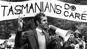 (at right, for many years the leader of the Australian Greens), thought otherwise. The photographs of Peter Dombrovskis and his colleague Olegas Truchanas, a good selection of which we had seen in the Launceston gallery, attracted significant public attention. In June 1980, 10,000 people marched through the streets of Hobart, demanding that the government not proceed with construction — the largest political rally in the state’s history.