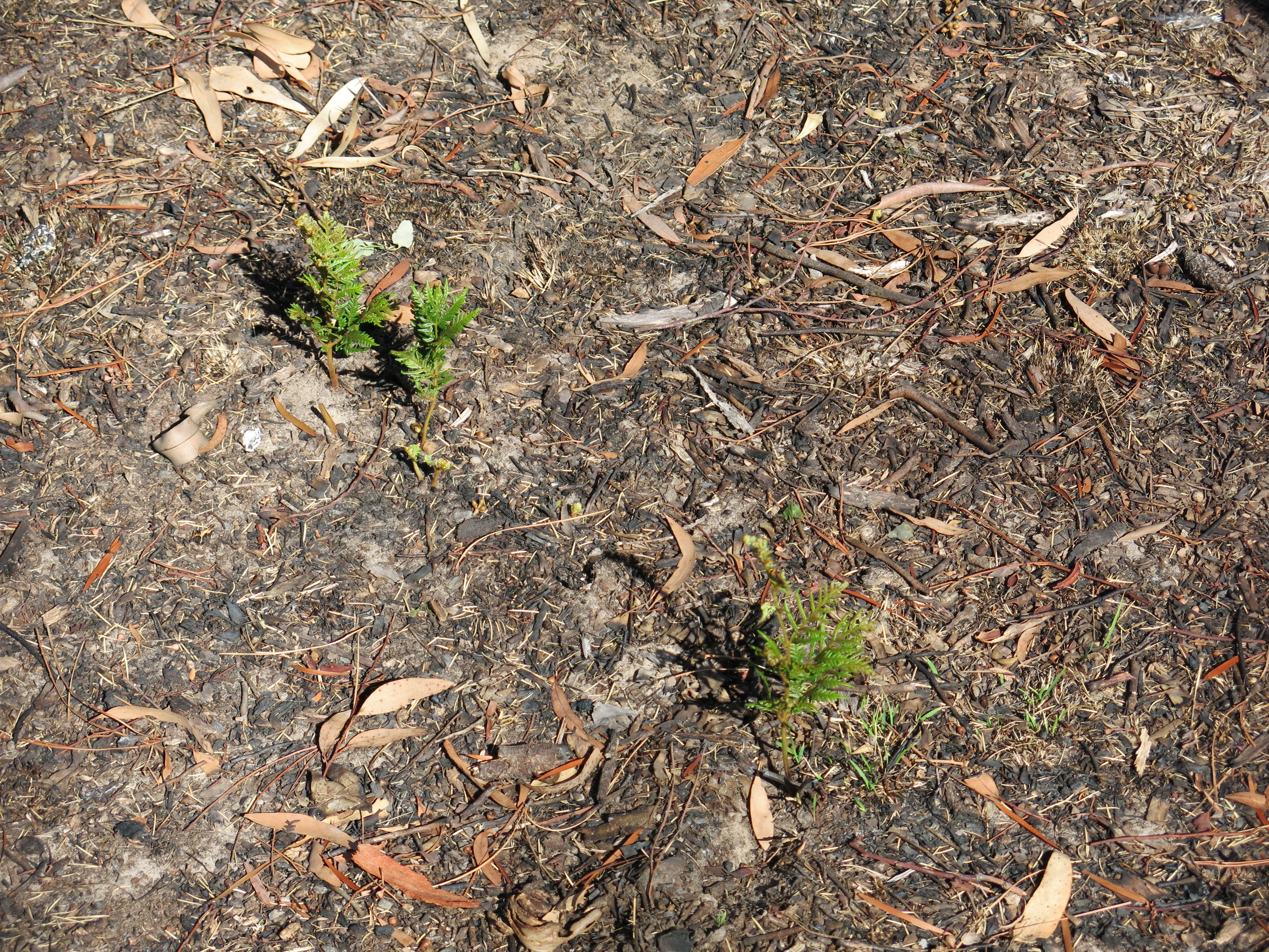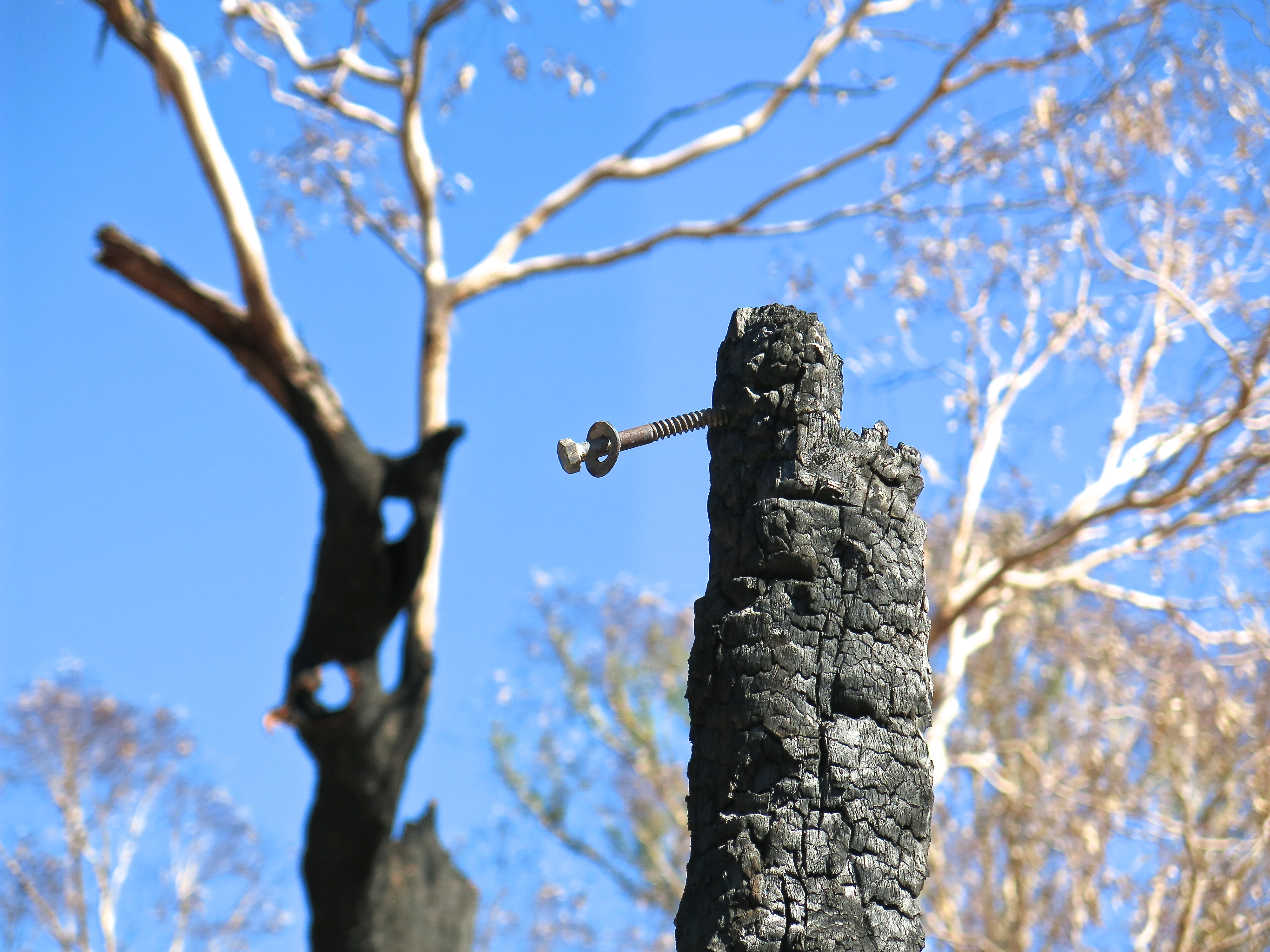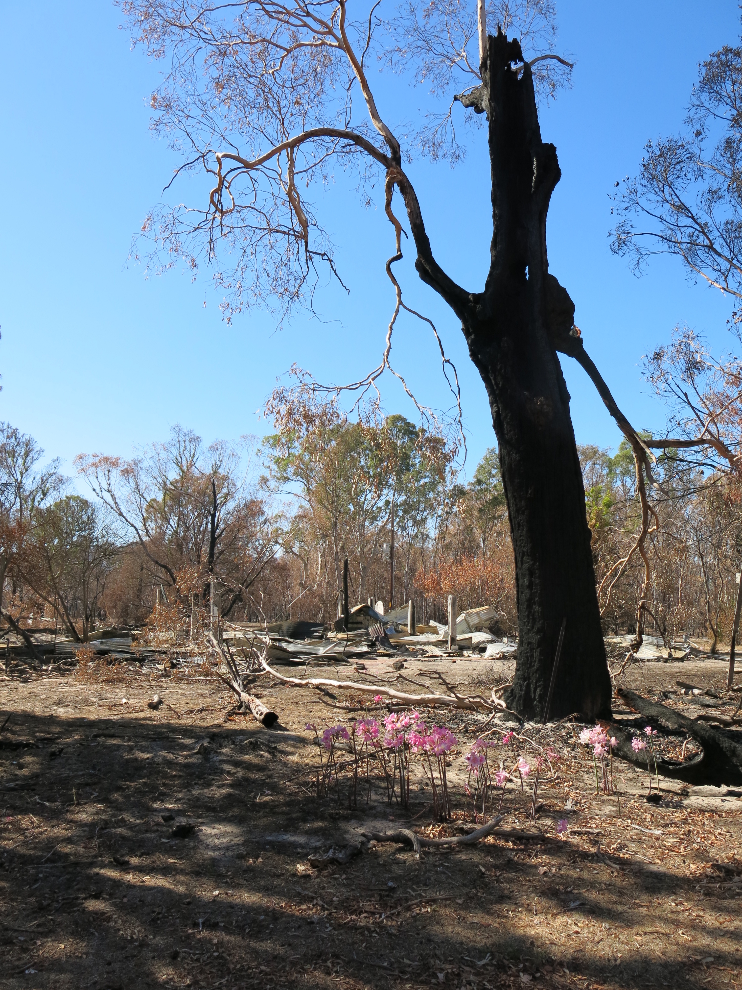 But it had all gone up. The ground cover, the heaths and the bracken, completely gone; not much sign of the second layer either, the melaleucas, the leptospermum, the banksias, the native pine. Many of the canopy trees were also damaged beyond repair. I was especially sorry about this huge yellow box which draped over our front veranda and had a family of phascogales living in it. IMG_0548Perhaps ironically, it would have been less damaged if it hadn’t been for the heat generated by the house burning. Not enough to kill those bella donnas though.