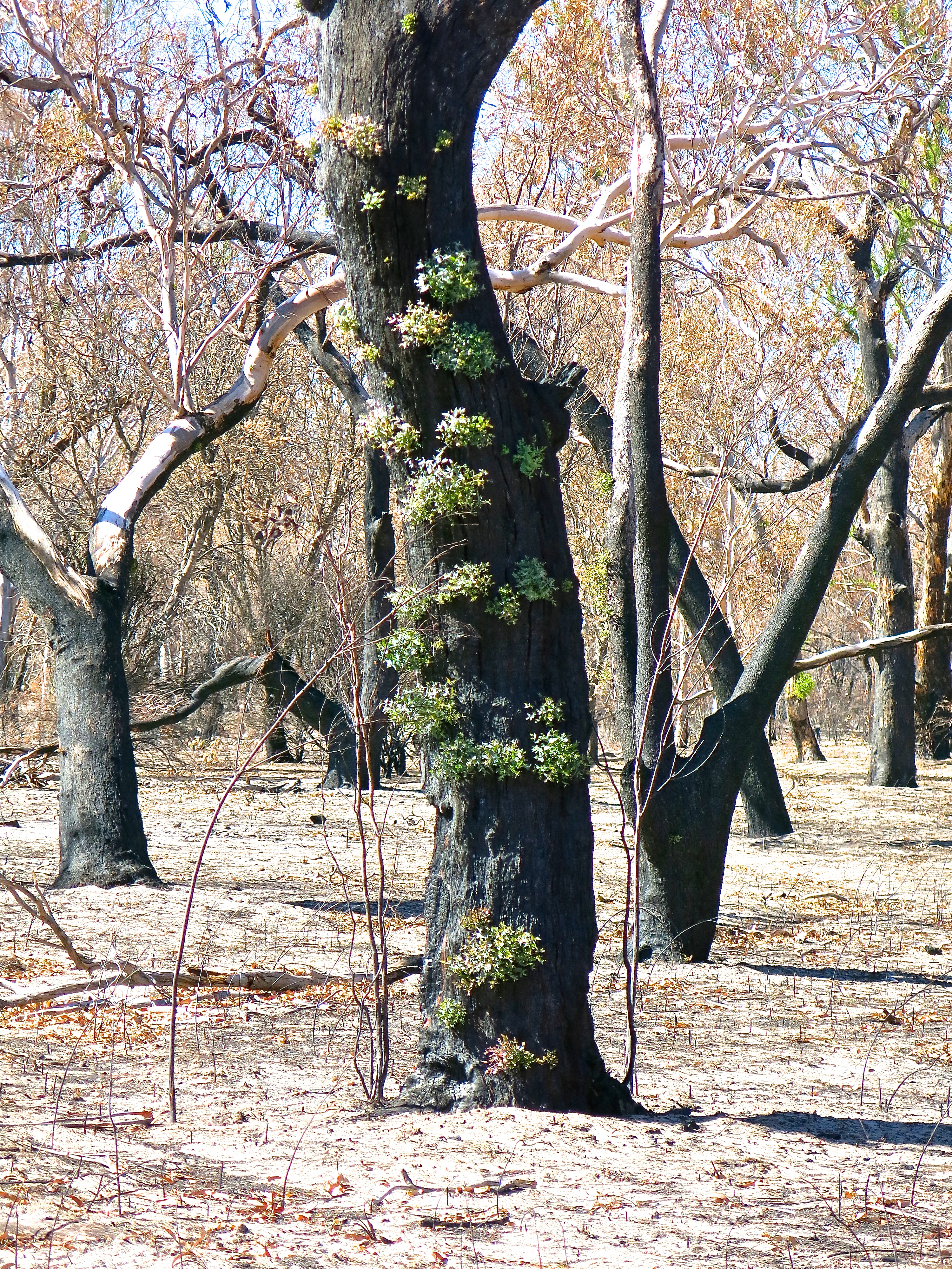 ‘Trees with rough bark such as Red Stringy Bark (Eucalyptus macrorhyncha) and Messmate (Eucalyptus oblique) have epicormic buds (dormant growth buds) deep beneath the bark, which are protected from fire. When the tree is burnt and the foliage removed, the epicormic buds are triggered into life and start to grow. Once these buds sprout, the tree then begins to regrow all of the lost foliage and, over time, will recover.’