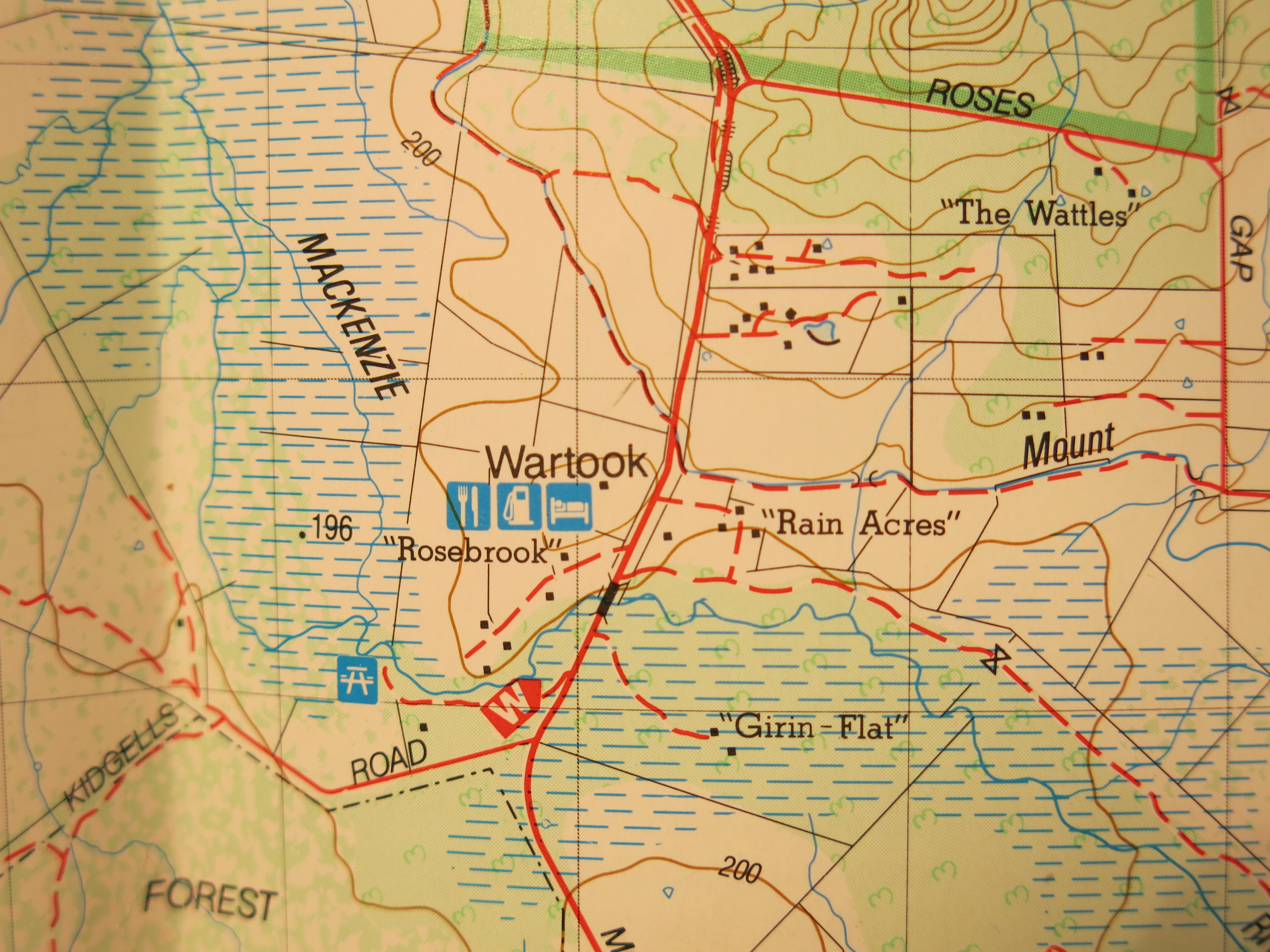 IMG_0785Further to issues of naming, here’s proof, of a type, from a Government of Victoria Department of Survey and Mapping map (Northern Grampians, 1994) that our property did exist. The area is called Wartook. When we were round there were nine (9) little black squares: four at ‘Rosebrook’ home of Peter Carter’s family, three at ‘Rain Acres’, Bernie Caelli’s holiday property, and two at ‘Girin Flat’. No others. No knives and forks, no petrol bowsers, no (public) beds. Our property was bounded by the road, the creek and the two black lines. ‘Joan’s paddock’ is the area containing the ‘200’ contour line mark.