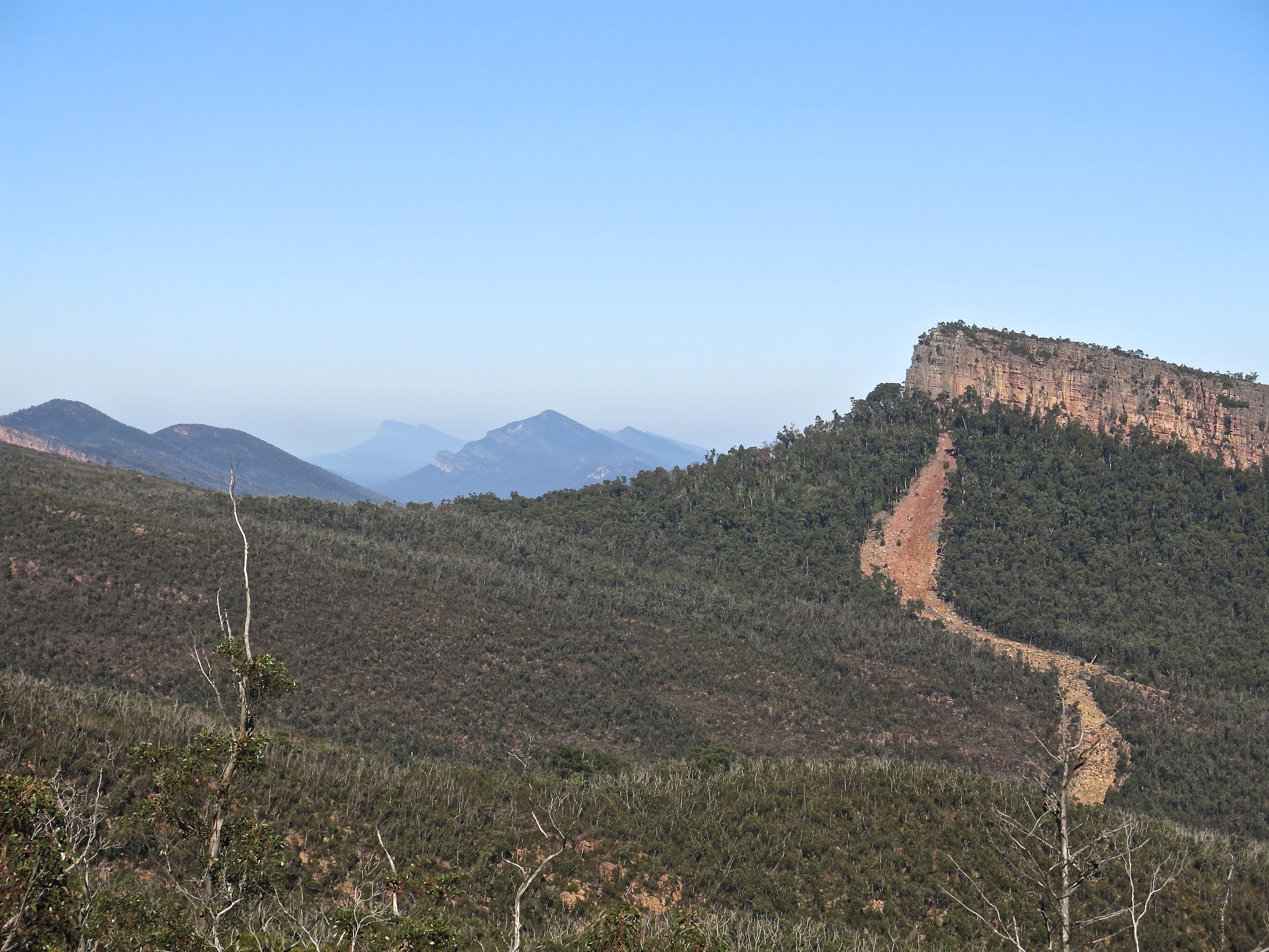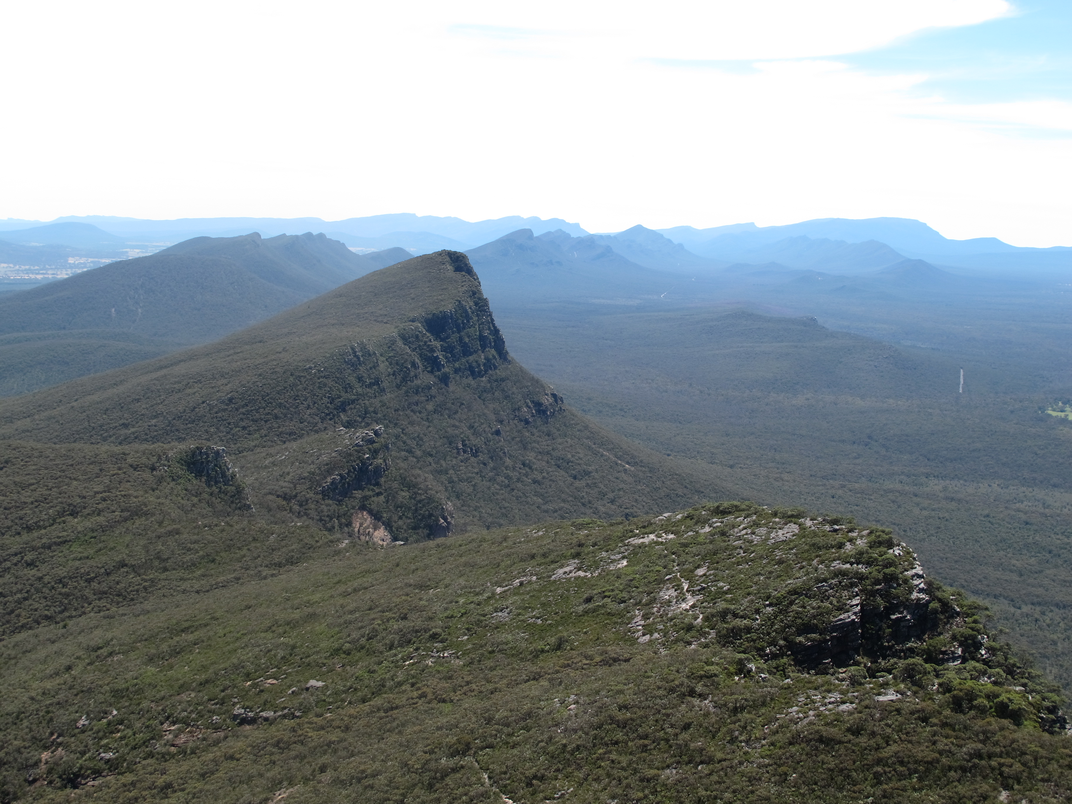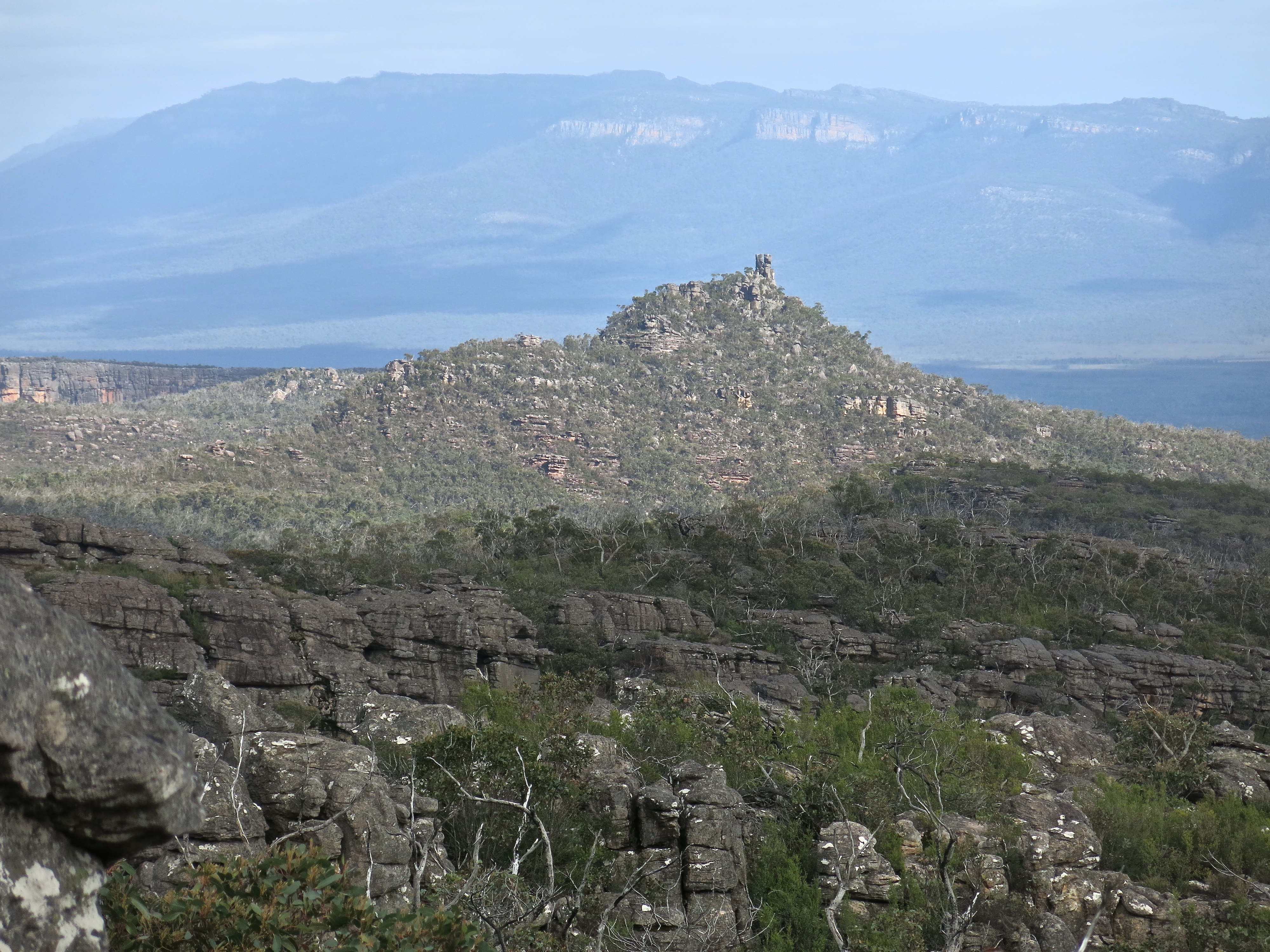 IMG_1410Unlike most of the rest of the Divide the dominant landform in the Grampians is the cuesta, a long slope with a sharp scarp, the result of folding and faulting. Except for a couple of granite outcrops in the Victoria Valley the Grampians are all sandstone, in geological time not long from the sea bed. [The pic? I’m on the peak of the highest mountain in the Von Guerard looking north. The hump on the horizon to the right is Mt William/Duwil.]