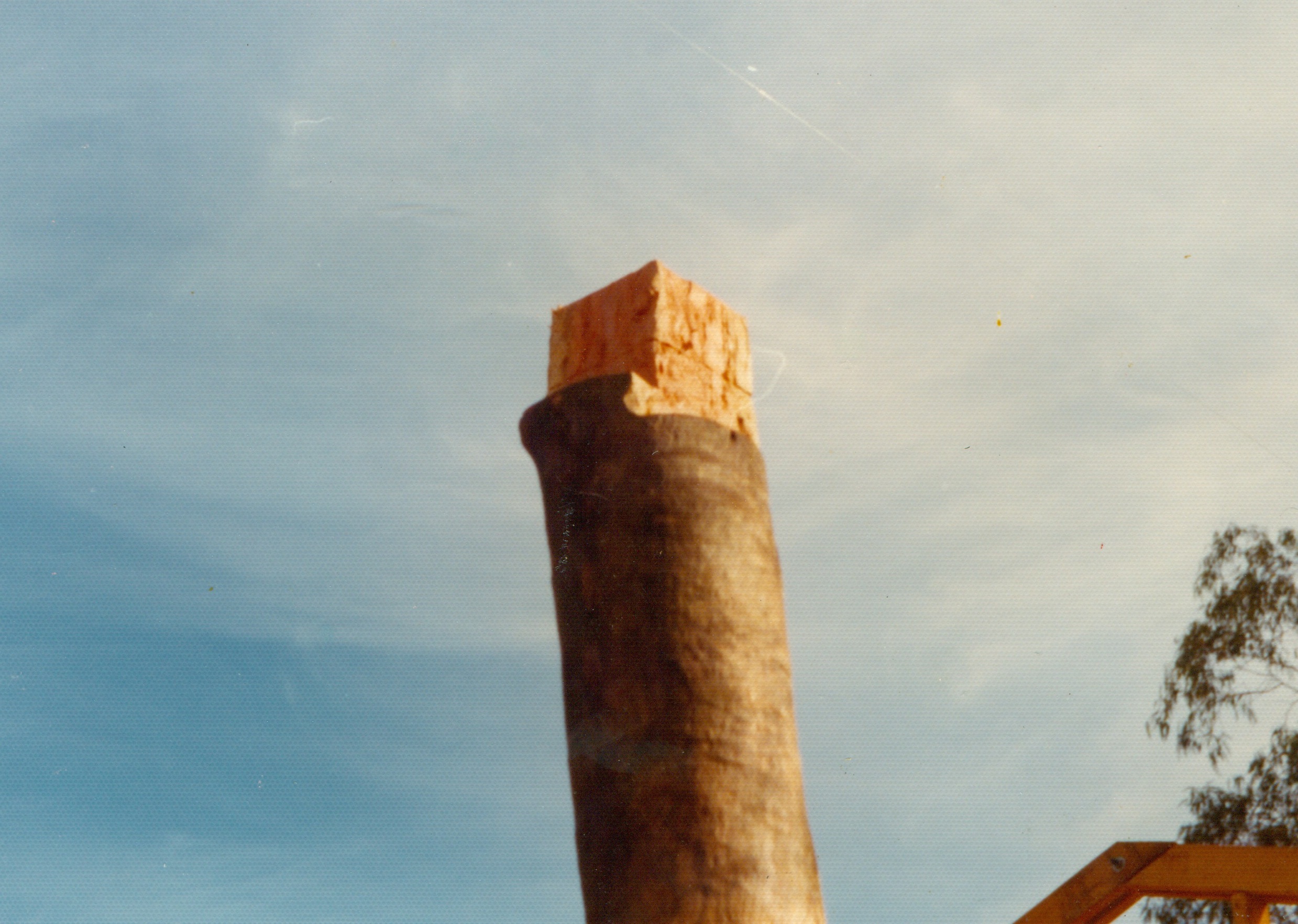 polesBy that time I had found, felled, skinned, transported and weathered the trunks of four big trees, two yellow box, one messmate, one stringy bark, and ended up with four big (reasonably) straight poles. On April 10th with the aid of my ute I got the poles in, and by the end of the 13th I’d finished the box for the slab. I did the preliminary feed plumbing on the 19th and the waste plumbing on the 20th. We were living in Horsham at the time and I was working on this at the weekends and sometimes coming out to the land after school. When I was doing my school work I’m not sure.