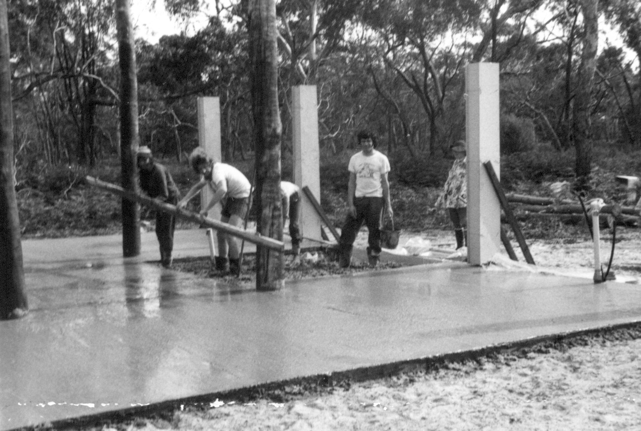 slab#1These pictures indicate the help: Robert, Myrna’s brother, in the white T-shirt, John and a very heavily pregnant Gabi who were living in Horsham, the Sproulls. During the whole enterprise we had a great deal of volunteer labour. It would be curmudgeonly to complain but, you know, a lot of time spent supervising, and as I got better at it, a certain amount of time spent pulling out work and doing it again. But on balance, you would never complain. In building there is a permanent role for at least a second person. There is so much repetitious hackwork and Mernz and Geoffrey Ainsworth did as much of that as I did and often more neatly.