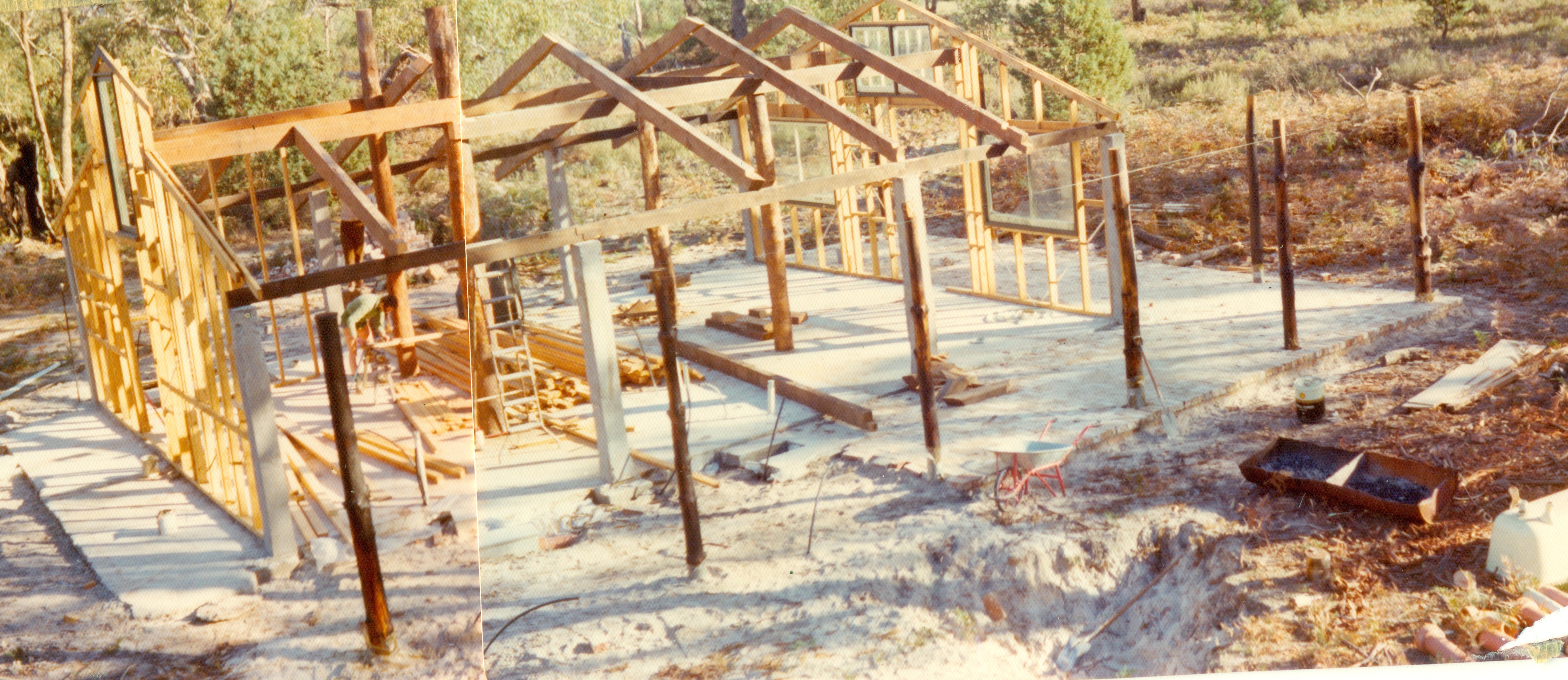 On the 20 May I was exactly 25 and a half and celebrated by buying 15 pine poles (the veranda posts, skinned and soaked in creosote and sump oil; Myrna had to be taken to hospital with an allergic reaction to creosote) from Horsham Rotary Club for $7. My father was round at the time and noted wistfully: ‘I guess you can’t make a straight veranda out of bent poles just as you can’t make a good world out of bent people.’ My mother concurred, importantly, as she was generally the authority on the moral dimensions of trees. But, on the other hand, while you may not be able to make a straight veranda you might be able to make one which is perfectly serviceable, and that might be the difference between the good tradesman, described elsewhere in these blogs, and me. (Below: Pole wrangling: Geoffrey Ainsworth, Rod Parker and the non-owner-builder.)logswhole frame25th May. The house now has a roof framework and a veranda that it didn’t before. The weather has come and gone a bit, a couple of nice days but mostly shitty and wintry [during two weeks of flat-out building in the May holidays.] Apart from a sore wrist and some tender fingers there have been no major mishaps. It’s interesting how with the addition of the form of the veranda the external aspect has changed and internally you are suddenly aware of these heights, especially in the bathroom, which are going to be lovely. Cutting and shaping the poles I don’t want to do again immediately.