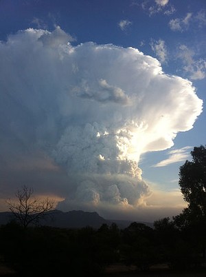 However this fire, like many in the Grampians, was started by a dry electrical storm. It began at several points towards the top of the photo and, driven by fierce northerlies, swept south. To see one of these fires in full pomp is to have nightmares for the rest of your life. 353wartook-300x0This is the fire cloud I would say nearly directly above the Wartook area where our house was located. This news photo was taken from Stawell, more than 40 kilometres away. Look at the comparative size of the mountains.
