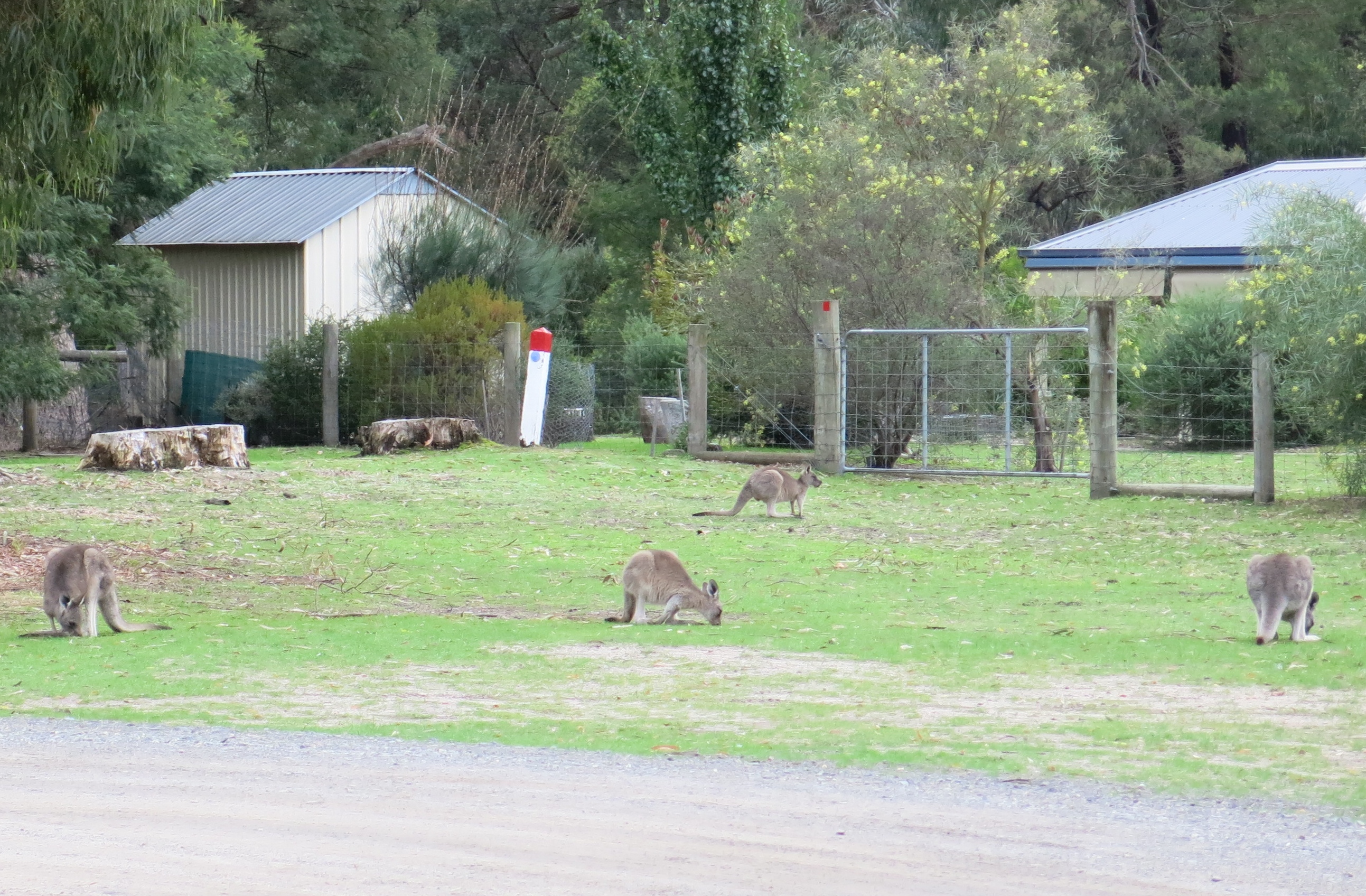 IMG_0832The Grampians are also alive with animals. There are more species of kangaroo living here than anywhere else in Victoria and they’re not difficult to find. This is one place in Australia where the tourist dream of kangaroos loping up the main street is realised. They particularly enjoy grazing on pasture, or lawn for that matter if it is available, and that was one reason why groups of hundreds of roos were common in Joan’s paddock. When the trees in our orchard started to grow kangas also proved to be partial to young fruit tree growth.