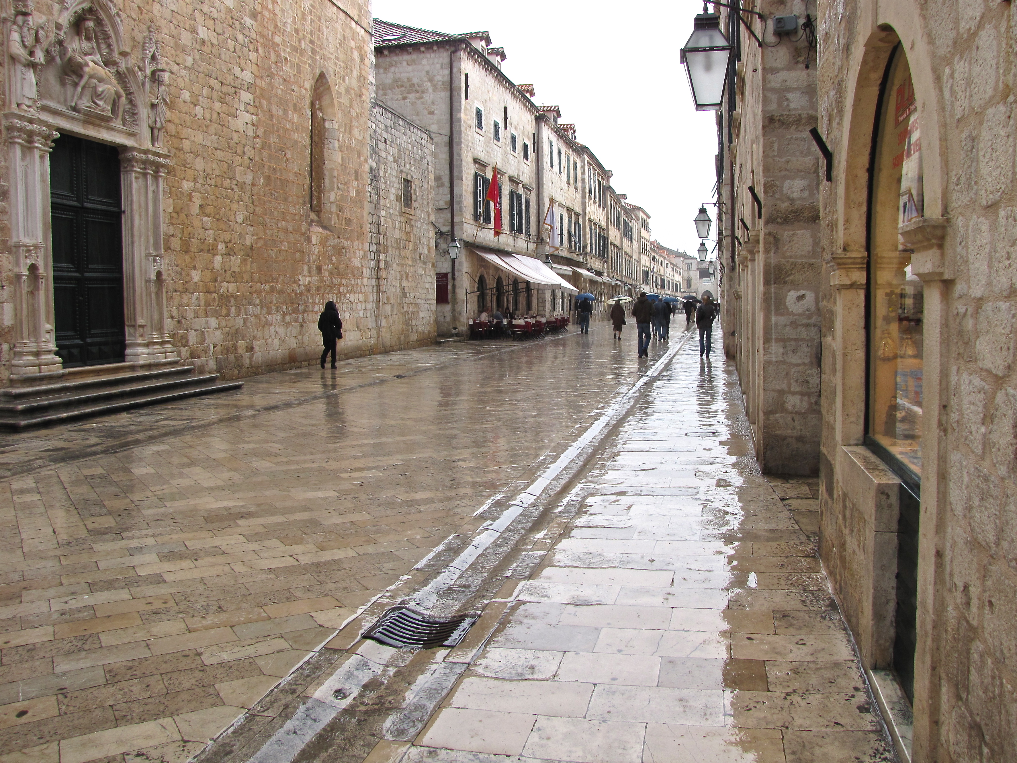 It is very beautiful from a distance. Up close it’s another old town with highly polished limestone streets, including the famous Stradun down its centre, and beautiful buildings. Ha! It rained, it hailed, it stormed. That may have influenced my judgment. Dubrovnik didn’t have as many tat shops as Venice but it had its share. We paid a lot for ordinary food. Despite its remarkable history as an independent and highly civilised state, we were at a tourist destination. In the recent war 3000[13] shells landed on Dubrovnik during the bombardment from the sea and the heights (all from about 8-10 k.s away from the city) and most seem to be remembered individually. You don’t have to go far to see photos of shell damage or a room devoted to death.