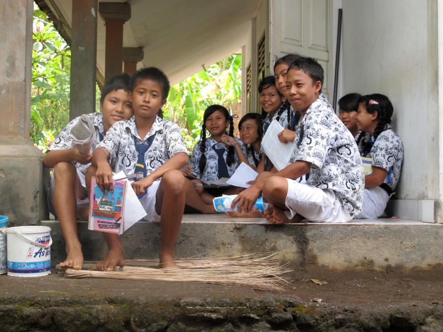 • The young chap in the front of the photo above is sitting on a veranda at Bebandem school on the slopes of Mt Agung in Bali. He is holding his workbook which describes where he is going to travel when he grows up.