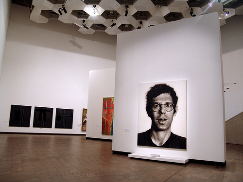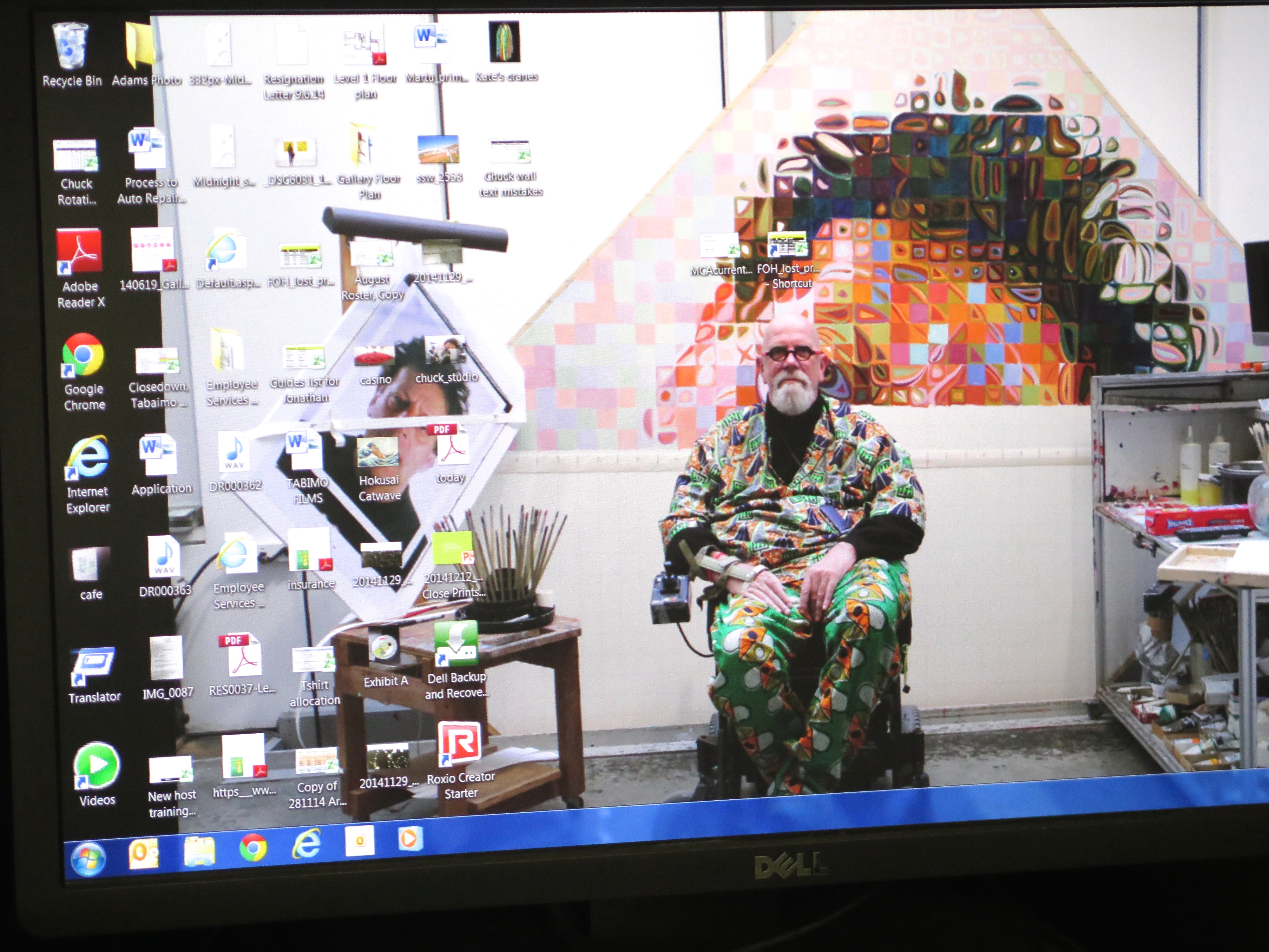 And this is Chuck. (It’s a photo that I took of the desktop of the computer at the entry counter.) He’s in his wheelchair. In December 1988, Close suffered a seizure which left him paralyzed from the neck down. A spinal artery had collapsed. He’s worked hard to get some mobility back and for some time he has been able to paint by strapping paint brushes to his arms and moving them — the second remarkable aspect of his career. So, rather than the very fine work with spray painter, airbrush and so on, his gestures have become larger and his media more wide-ranging.