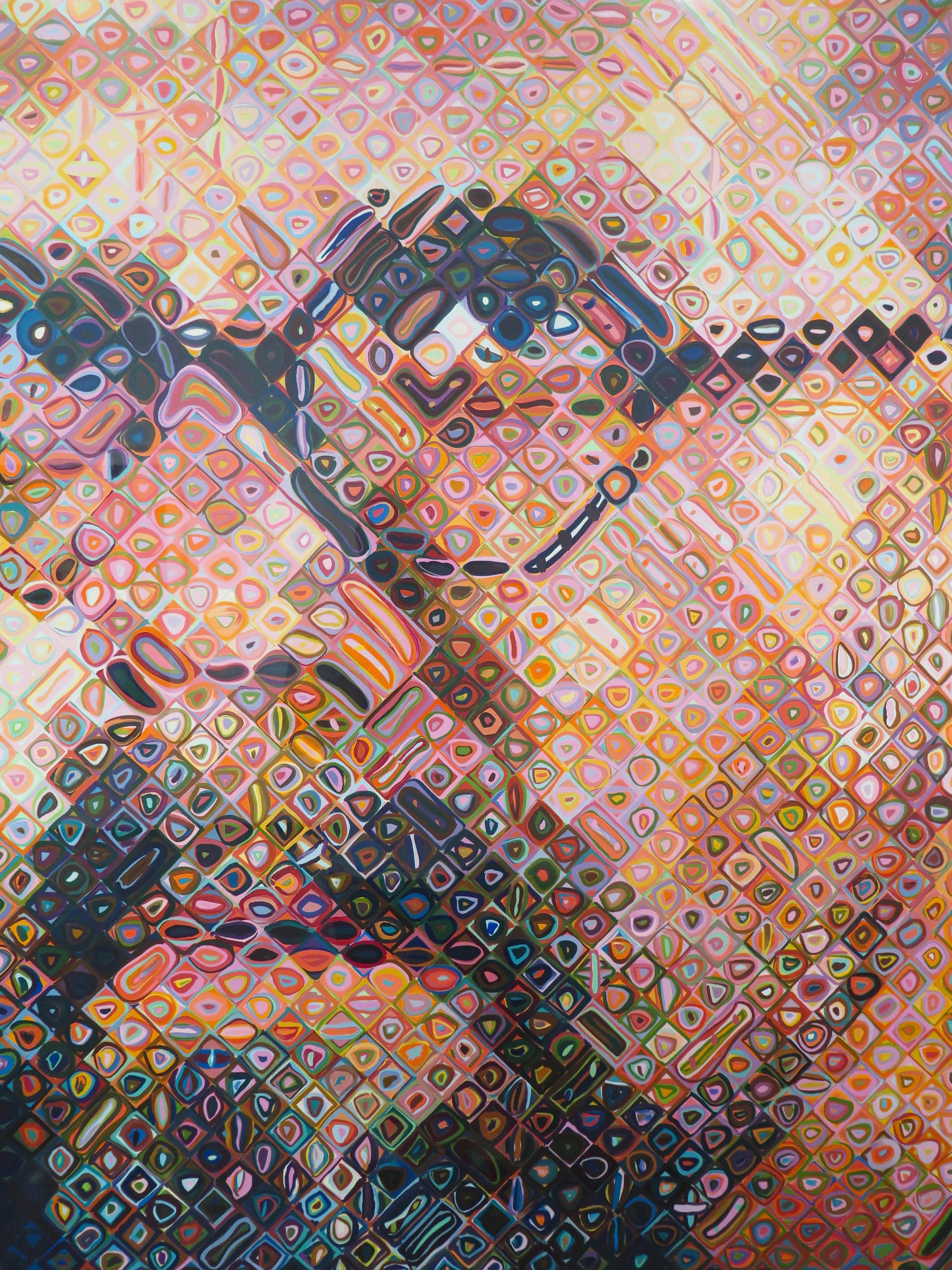 Perhaps paradoxically, Bob the subject (Robert Israel) has said: ‘I had wanted Chuck to ask me to pose for him, but I really didn’t feel it was proper for me to ask. Chuck’s decision of who he would paint had to do not only with whether you were a friend, but with the topology of your face.’ What’s he seeing there? Close tells his own story about Bob. ‘I had taken a break and was walking back into the studio. Looking at the painting, I realised that a highlight in one of the eyes was too bright. And I said, “Damn it, now I’m going to have to take his glasses off”. But when I realised what I had said, I pivoted on my heel and walked out leaving the lights on, the compressor on and the airbrushes full of paint. When you start believing in your own illusion, you’re in serious trouble.’ Clearly his relationship with his work is complex. Is this another version of the idea of art, high art, fine art, being a product of dysfunctionality?