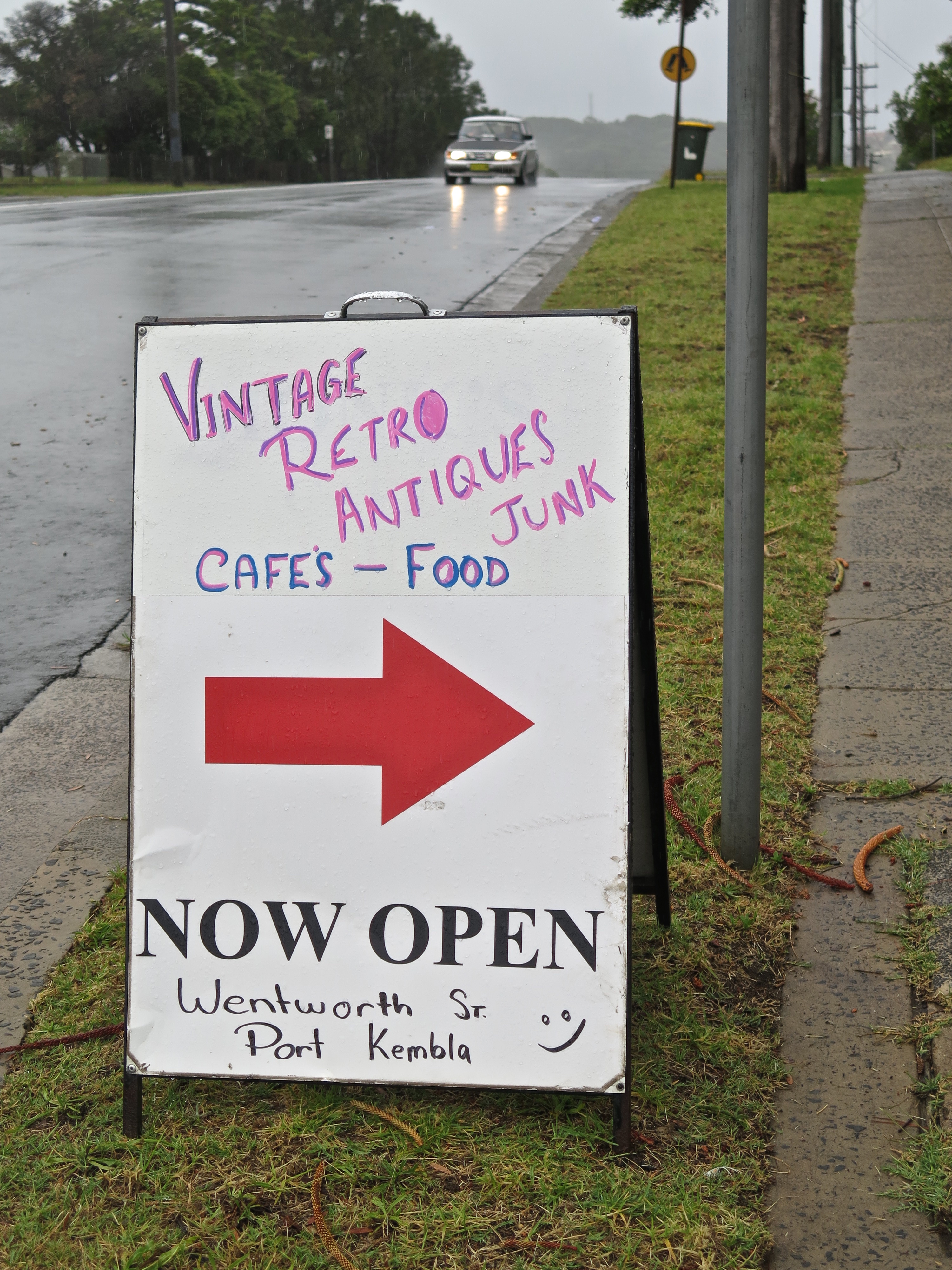 Besides a whopping bottle shop, the eastern end is growing a cluster of bric a brac and antique shops, and a bakery with fabulous smells. Amanda Johnson (at left) collects and sells vintage material and makes it up into wonderfully inventive bits and pieces. Dulcie Dal Molin is president of the Red Point Artists Association based in a Wentworth Street property and organises the Billycart Derby. The Illawarra Mercury quotes her: ‘Since the first revived race in 2012, Wentworth Street now has boutique wedding shops and an arts precinct.’