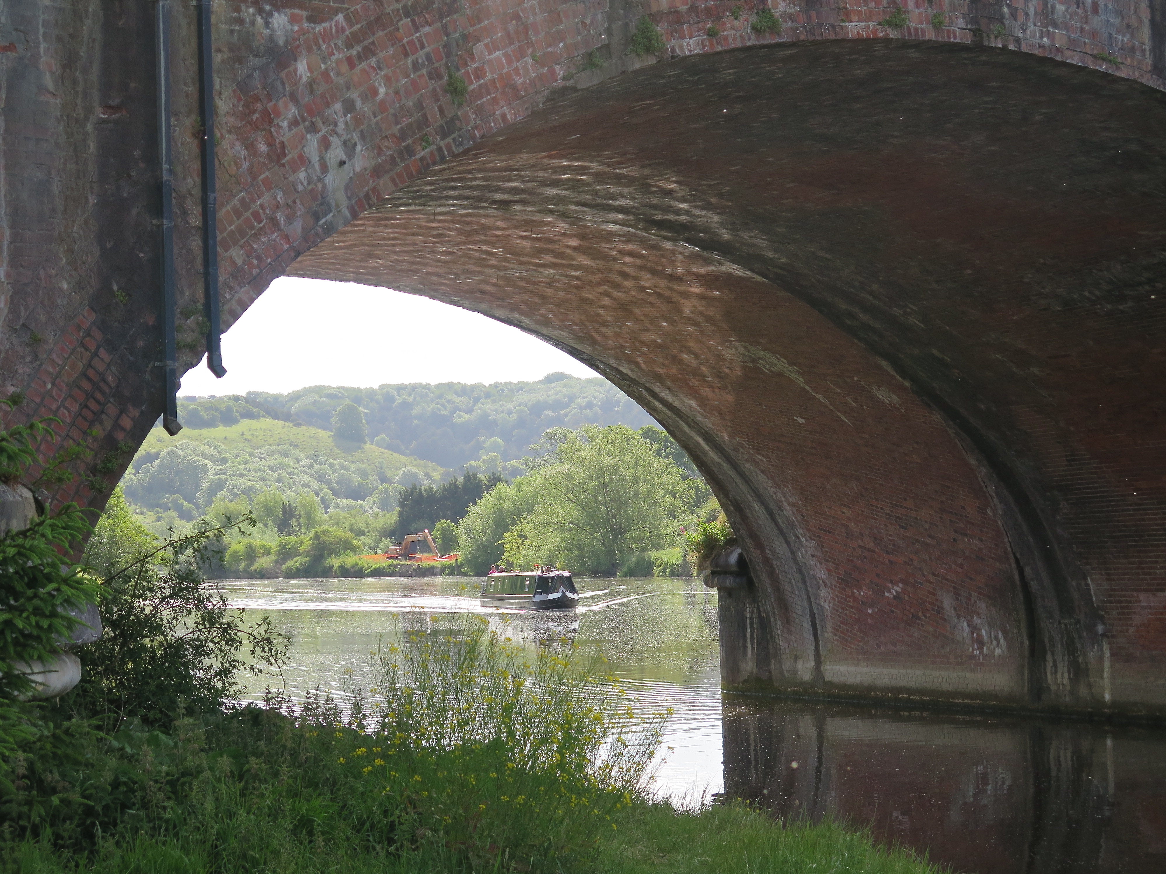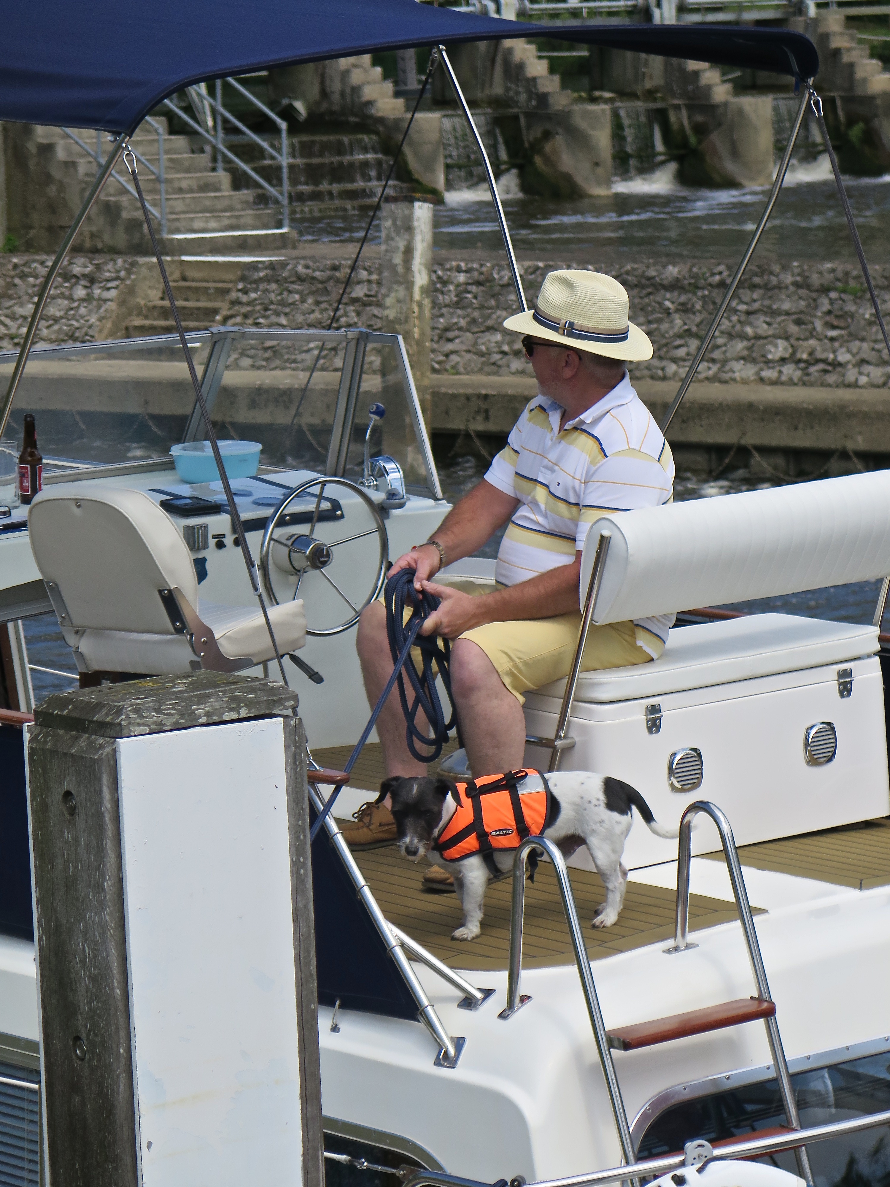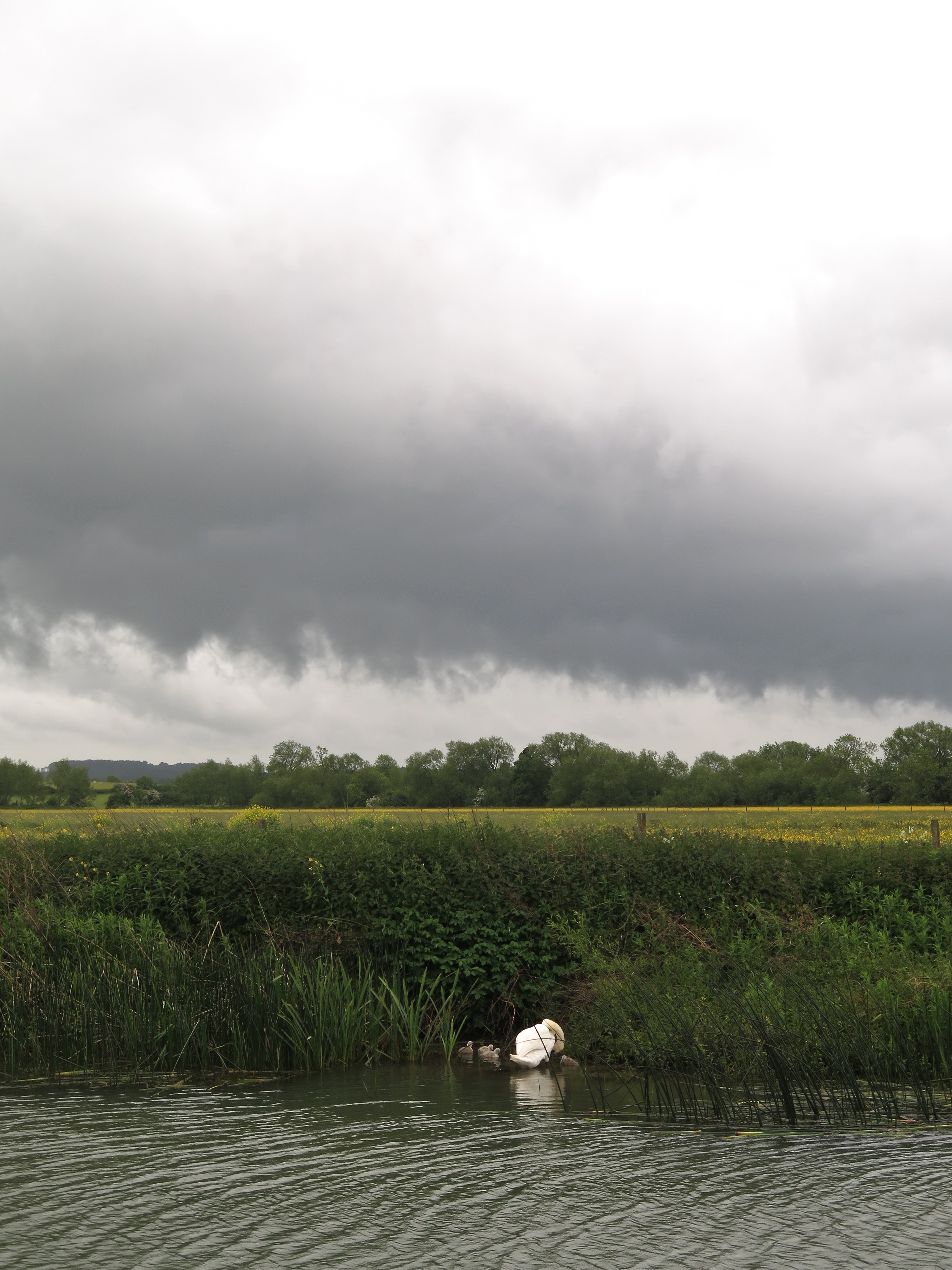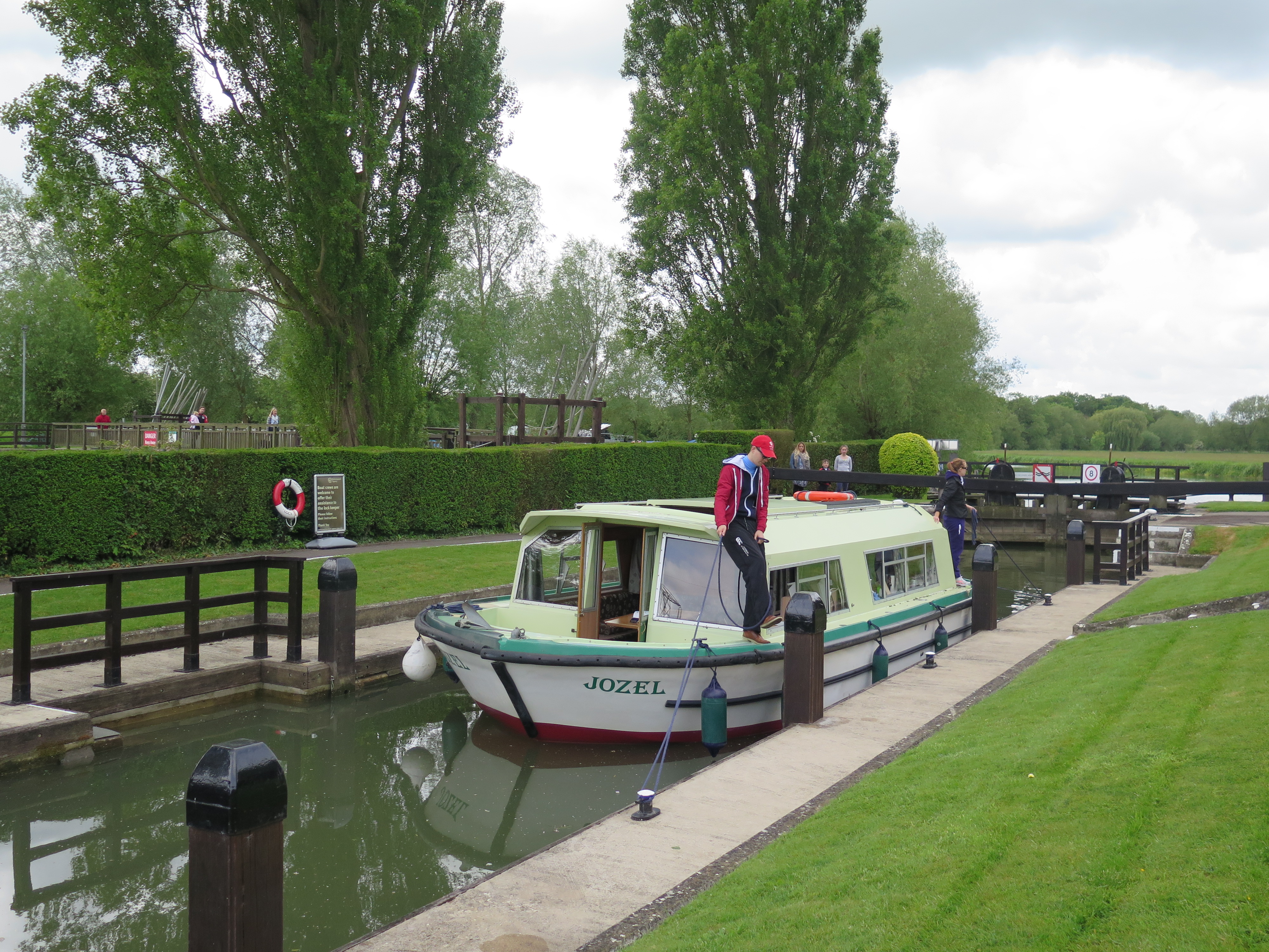 My journal says: ‘A long stretch of slightly crap properties. The houses needed painting or the garden cleaning up or getting the rubbish out of the yard or the barge boards repairing.’ Even the boatbuilders’ yards were like that — just massive tumbles of junk. Unworkable you would think. I wondered if we were looking at backyards and shortly we were, on both sides of the river which had shrunk in width. The guidebook says: ‘Along riverside Staines, the little houses, in their infinite variety, still reflect the joy of simply living by the Thames.’ Maybe. Your choice.