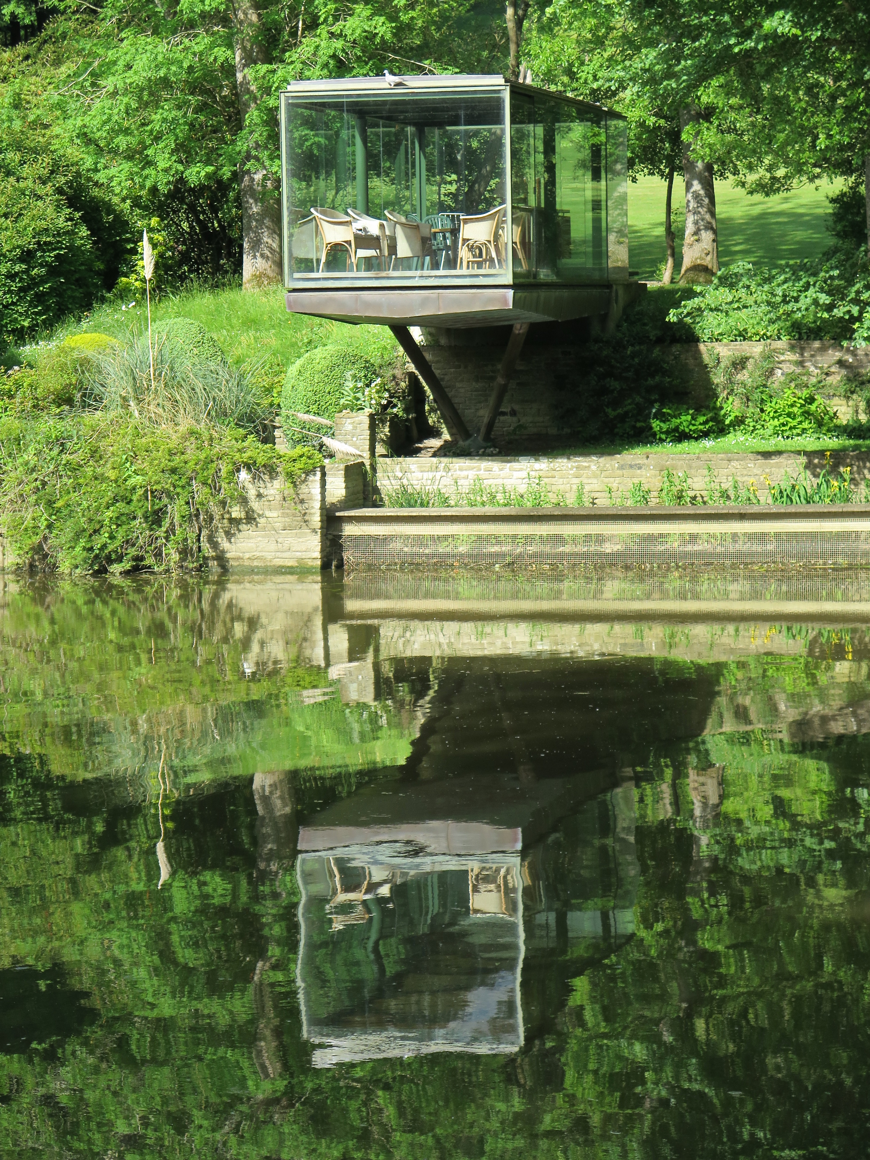 We seemed to arrive at East Molesey in no time, Molesey being to Hampton Court as Windsor was to Eton, a neighbour across the river where the humans live. At the East Molesey Cricket Ground we found exactly the sort of cafe required for lunch the name of which escapes me. No it doesn’t, I wrote it down: Thyme by the River. Who could have forgotten? Ha ho. We got the very best table on a mild and still English summer’s day,