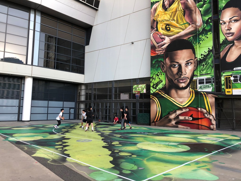 Some kids were playing basketball watched by Ben Simmons and Liz Cambadge.