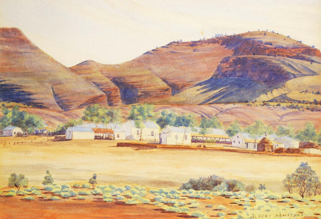 NOTES: None of Albert’s paintings, all water colours, included here look anywhere near as good as they do in reality. In real the colours quiver and melt into each other in a way they just don’t when digitally rendered (a process which is always looking for and defining borders, in or out, yes or no, sharp not soft) or for that matter when they appear in the pages of an art book. The shadows are both more profound and more intelligible. The perception of depth is much more evident and dramatic. See them in the flesh if you can. Anyone could have taken the landscape photos below in this extraordinary country, but I did. They were taken while walking through the Western MacDonells on the Larapinta Trail, one of the world’s greatest walks, starting at Alice Springs’ Old Telegraph Station and finishing at one peak of Mt Sonder.