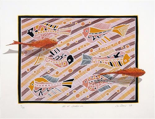 Other artists may seek and be granted use of a particular rrark. After a visit to Arnhem Land, contemporary southern artist Lin Onus made such a request for a series of his paintings. This is Koi at Sankei-En. Just to complicate things further, Sankei-En is a garden in Yokohama and koi the Japanese carp which fill the ponds of formal Japanese gardens.)