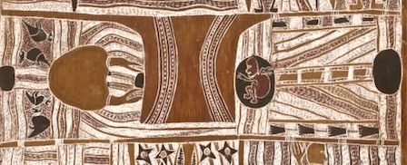 Creation Stories has enormous intellectual interest but there is also something aesthetically enticing about its controlled busyness. There is a lot to look at. The figures are silhouettes, sometimes decorated sometimes not. (This tradition also includes ‘X-ray’ creatures.) It is balanced vertically and horizontally, but without troubling to be symmetrical. It is the work of a master pattern-maker.