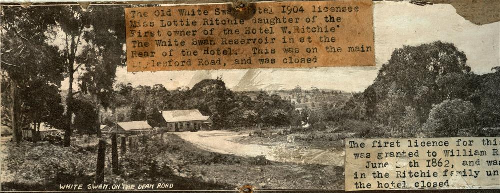 This picturesque old inn was opened on New Year’s Day, 59 years ago to-morrow, and during that long period the names of only two licensees have appeared over the door, the late Mr. Ritchie who opened it and who died 18 years ago, and his daughter, Miss Lottie Ritchie, the present licensee, who succeeded him. Father and daughter became inseparably associated with the old house, and they imparted to it much of their own personality, and a very kindly, lovable personality it was. … The founder of the White Swan picked on a beautiful site for his hotel. It is surrounded by some of the most lovely forest country in the district. Only the road separates the forest from the front door, and one steps almost from the back door into another stretch of beautifully timbered country. It was so when the house was built, and it is so to-day.