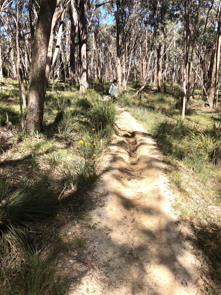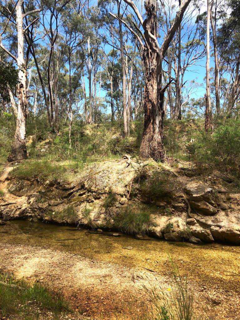 Slaty Creek has had a good whacking. This bank here has been hugely eroded by high pressure hoses, evident for 800m or so. Four thousand diggers were here in the 1850s and seem to have been particularly frantic and destructive in their early drives. From a report 170 years ago, ‘A lovely park in the midst of heavily wooded ranges has been turned upside down stripping away the fertile flats, luxuriant and vividly green grass as well as the huge white gums.’ But this is not a grizzle. Not this day. Those gums (candlebarks I think) re-appear in fine stands a couple of km further down the creek. The track was unpeeling in a constantly stimulating way.