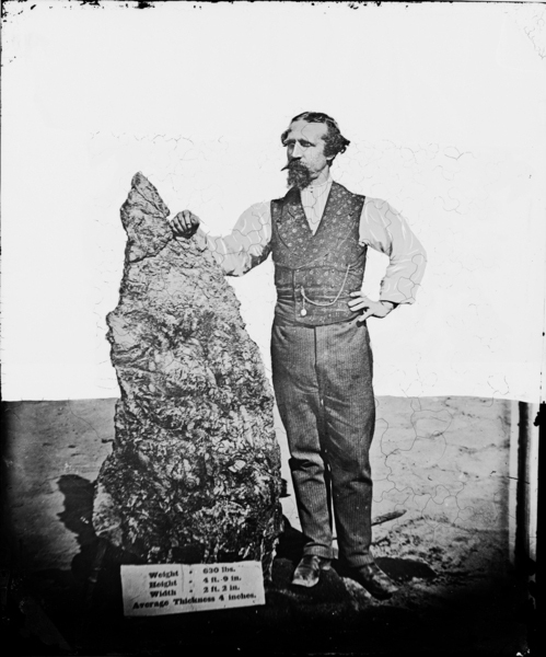 A competitor to The Welcome Stranger for the largest single deposit of gold ever found is the ‘Holtermann Nugget’. And right here is Holtermann with his ‘nugget’. A Prussian who left his country to avoid military service, he set up a mining operation near Hill End in NSW which for many years was unproductive. Then on 19th October 1872 a midnight firing of explosives revealed a ‘wall of gold’ of which the ‘nugget’ was part. Weight: 630 lbs, Height: 4 ft 9 ins, Width: 2ft 2ins, Av thickness: 4 ins, Value £12,000. But it is not a nugget. It is a ‘specimen’, a matrix of slate, quartz and gold, reef gold, which when crushed produced 3000 troy ounces of gold, quite enough to make Holtermann a rich man.