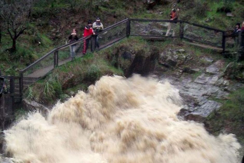 If you look at the water in this photo, in which intrepid photographer taking photo of tree trunk jammed in Blowhole has scaled cliff face, you will note just how fast the creek was flowing.