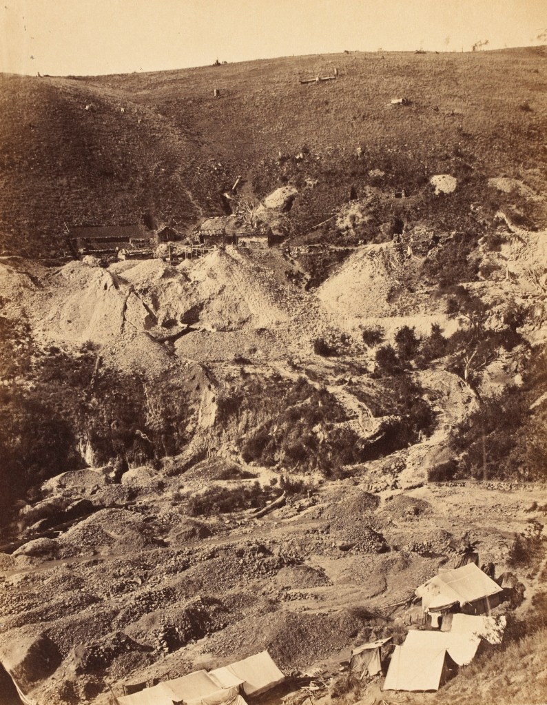 Just a bit further north, Sailors Creek seems to break into Jim Crow Creek and Spring Creek. The Jim Crow gully (at right, Raintree’s photo, 1854, devastation) was very heavily worked for gold and a group of miners, European and Chinese, decided there must also be gold to be found a bit south and that there was an attractive opportunity for getting at a creek bed which they could dry out. Sailors Creek takes a big loop right at this point, so to divert the water, they blasted and dug a hole through a rocky spur to make a much more direct route for the creek. That dry loop was very intensively worked over without much profit leaving behind The Blowhole as something of an oddity in Victorian goldfields mining, something now just to exclaim over.