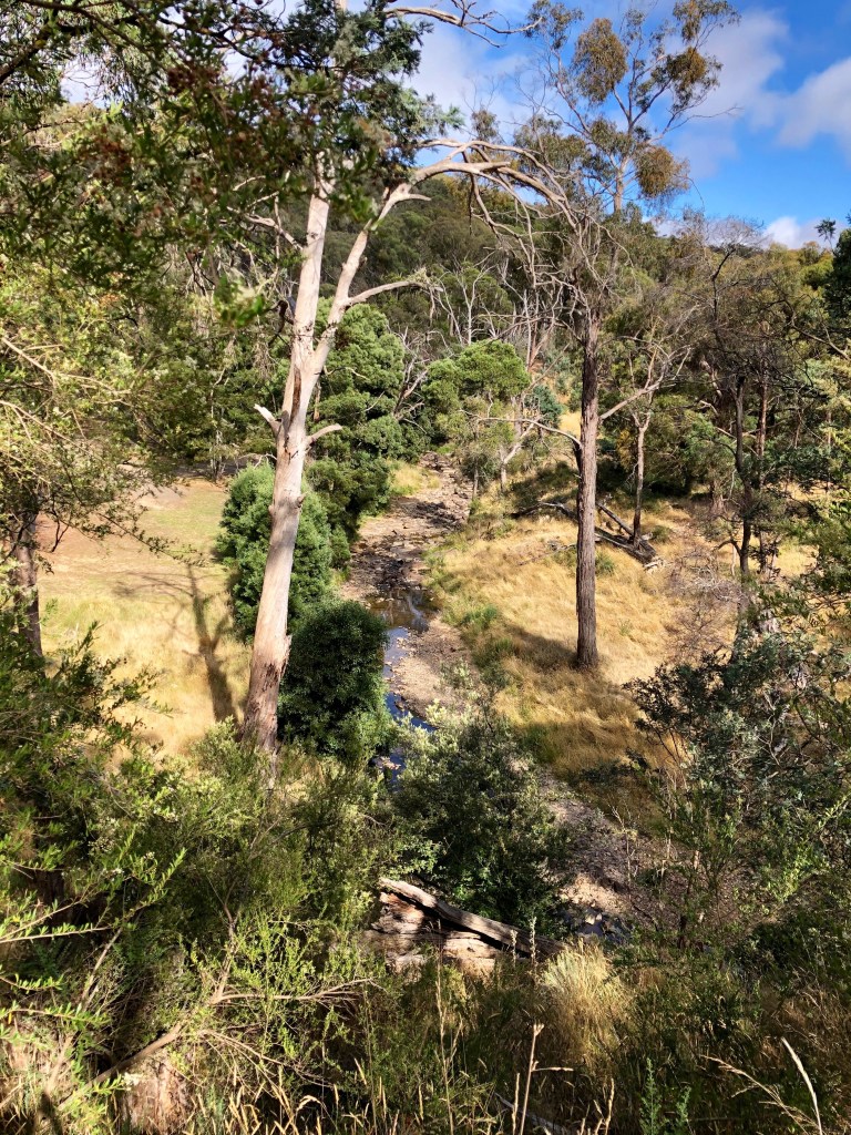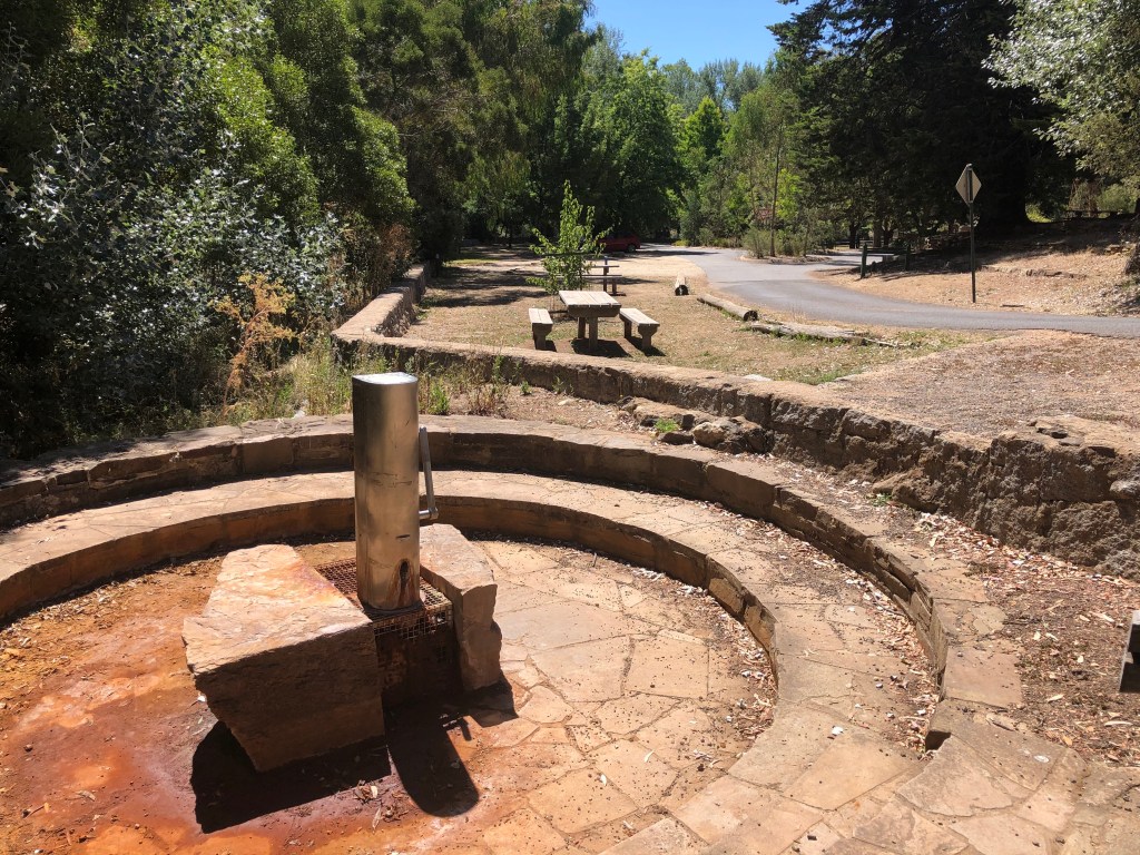 A classic walk. No self-respecting guidebook to walks in Victoria would leave it out. Easily accessible entry, comfortable length, but you don’t have to do it all. There are three or four places to get off and go back to the Hepburn Springs-Daylesford Road or more directly into Hepburn Springs. It’s straightforward. You’re just following Sailors Creek which you can do either side. I think the educated preference is for the eastern side: you get higher and the views are longer. Interesting features. Well maintained. Depending where you start and how far you want to deviate from the track, there are three, four or five mineral springs, two of which are sure to be running. The end, going in our direction, is the gardens and terracing surrounding Hepburn Bathhouse & Spa and, if you’re so inclined and have made a booking, the pools, the baths and the attentions of the Bathhouse itself.