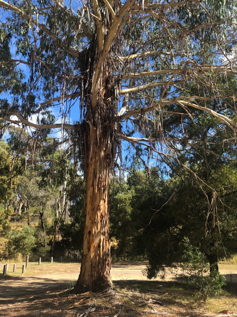 In the clearing at Tipperary Springs is this striking tree which I am going to designate E. viminalis. When I consult my copy of Eucalypts of the Mount Alexander Region (Slattery, B., Perkins and Silver, and highly recommended) I find that viminalis is Latin for ‘like a willow’ and refers in this case to the way the foliage weeps. They are sometimes called ribbon gums, and here there are a plethora of bark ribbons. I also find that the common name, Manna Gum, is derived from white nodules exuding from insect holes in the bark which are, or perhaps were in the past, relished by Aboriginal people — manna.