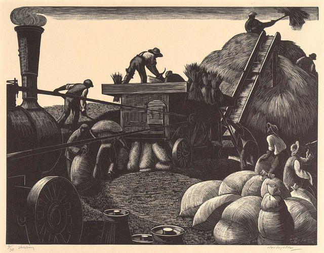 The exhibition I enjoyed most was called ‘Leaving for Work’, perhaps 40 pieces again often early 20th century about people at work. ‘Threshing’ (below), a woodcut print by Clare Leighton (1933), caught my eye along with its companion ‘Apple Picking’. She has found some wonderful blacks along with extremely inventive hatching. And look at that smoke coming out of the steam engine. Somewhere near here is one of the places that craft truly meets art.