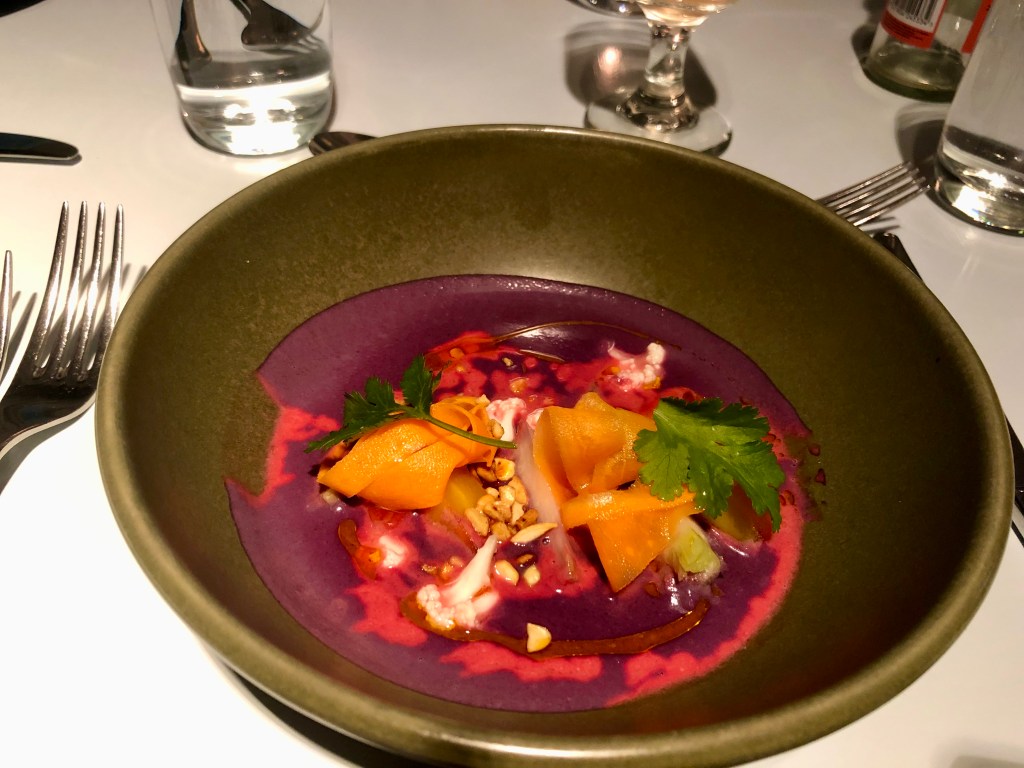 Myrna had the vegetarian offering and I’m pretty sure this was ‘Ettrick’s Carrots’, a soup with lemongrass, coconut, cashew, coriander, lime and paw paw. The purple is the carrot, the flavour of which I can only describe as enticingly warm.