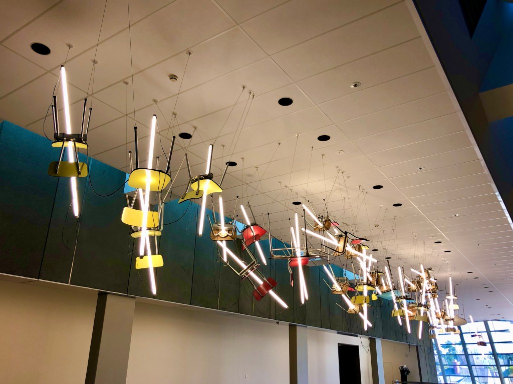The light fittings: 60s kitchen chairs with neon tubes through them. Why not?