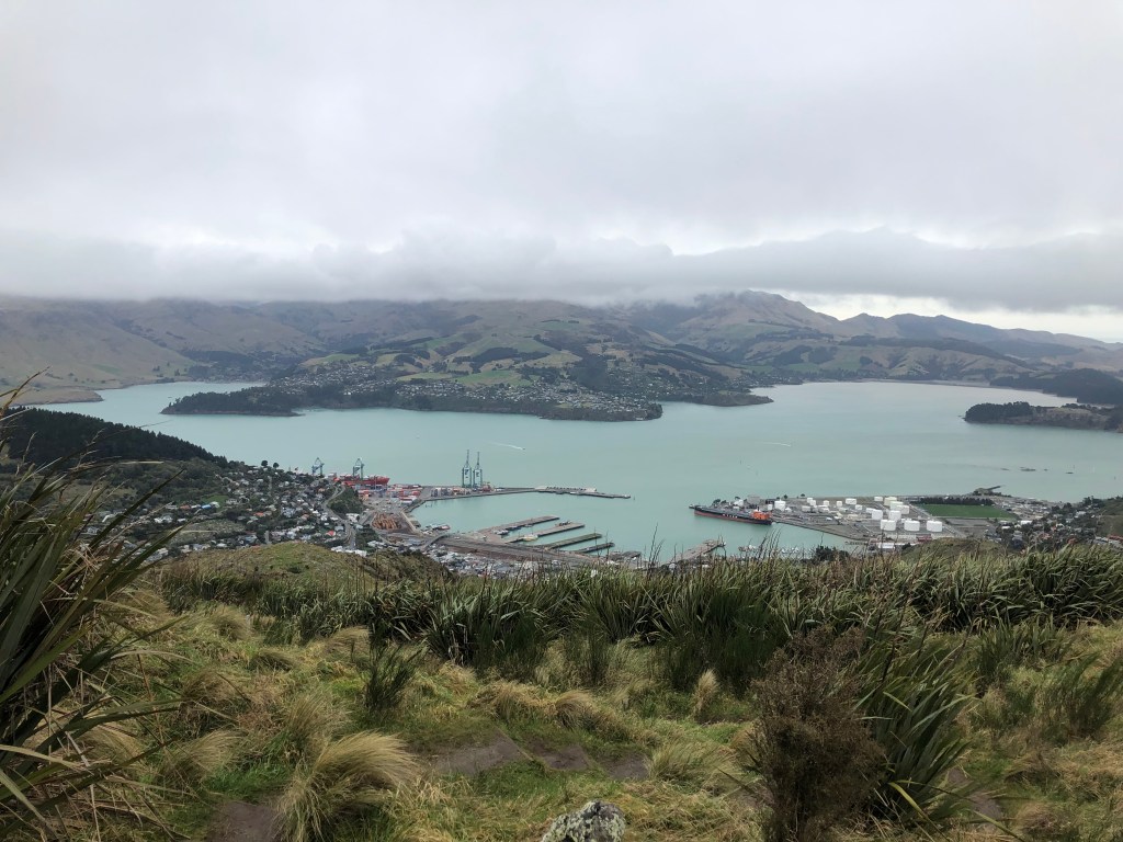 Separating the city and Lyttleton are the Port Hills, the crater rim, just fine for a walk. On this Saturday morning it was a sharply cold day with drifts of rain and some fierce wind up high, but we were there with dozens, scores, hundreds of locals mooching walking running riding not really noticing the weather. New Zealand.
