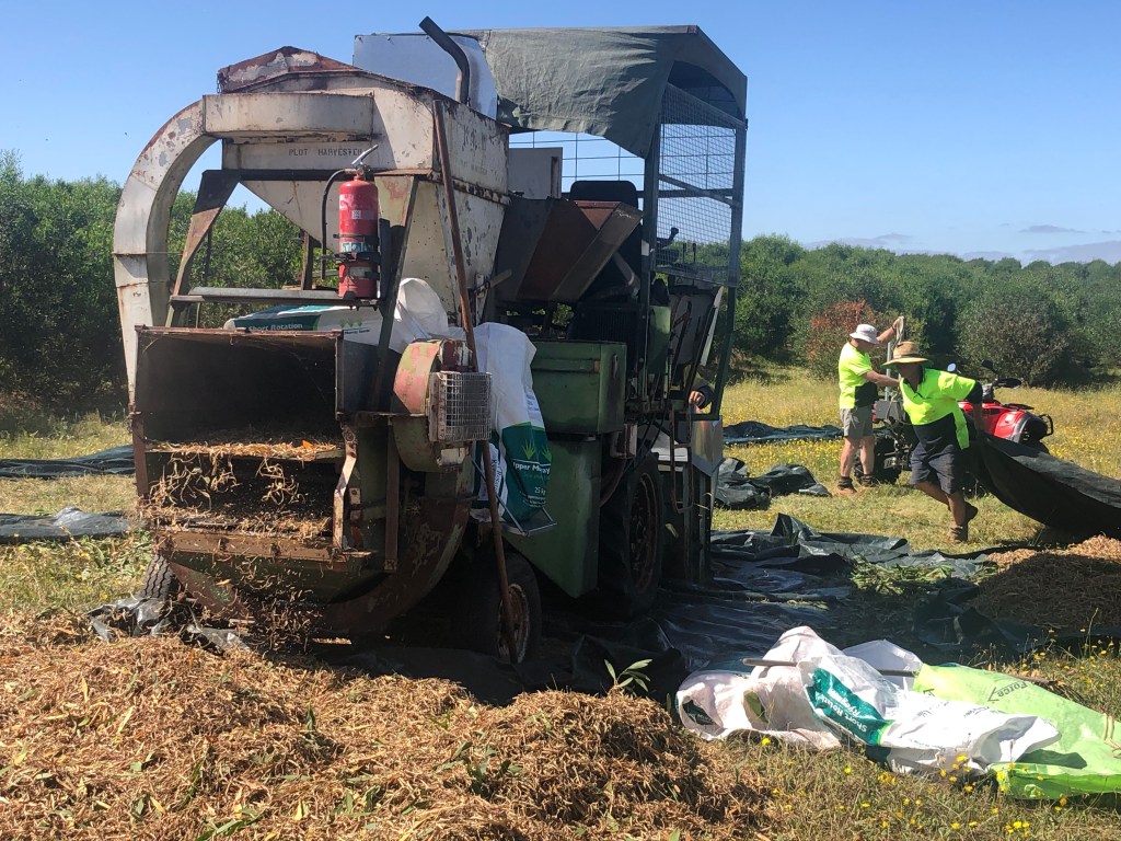 Harvesting wattleseed as practiced at Tarrington has delectably basic elements. After putting your tarp underneath, you hit the tree with an aluminium pole. On the right day, at the right temperature, with the right humidity, the pods full of seed will drop. The tarps are dragged off to the seed cleaner into which the crop is fed. The result from this process is about 80 percent seed. The pile of empty pods is here in front of us. This machine, straight out of a Thomas Hardy novel, is about 60 years old but the staff of Arborline know a good thing when they see one.
