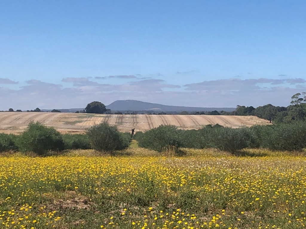 One edge of Australia’s largest wattle seed farm. 70 acres/ 30 hectares of plantings, maturing quite quickly as acacias do. Wattleseed? ‘Wattleseed must be considered the unsung hero of Australian native foods, as it is a very rich source of protein. Since the 1970s, Wattleseed has been grown in Africa to provide protein to drought-affected populations. It is a low glycaemic food, which releases its sugars slowly and can be used by people with diabetes to help maintain blood sugar levels. Wattleseed also contains high concentrations of potassium, calcium, iron and zinc. Wattleseed has a nutty, roasted coffee aroma, with touches of sweet spice, raisins and chocolate. It has a savoury, nutty, wheat-biscuit flavour. Mount Napier, another of those wonderful cones, in the background.