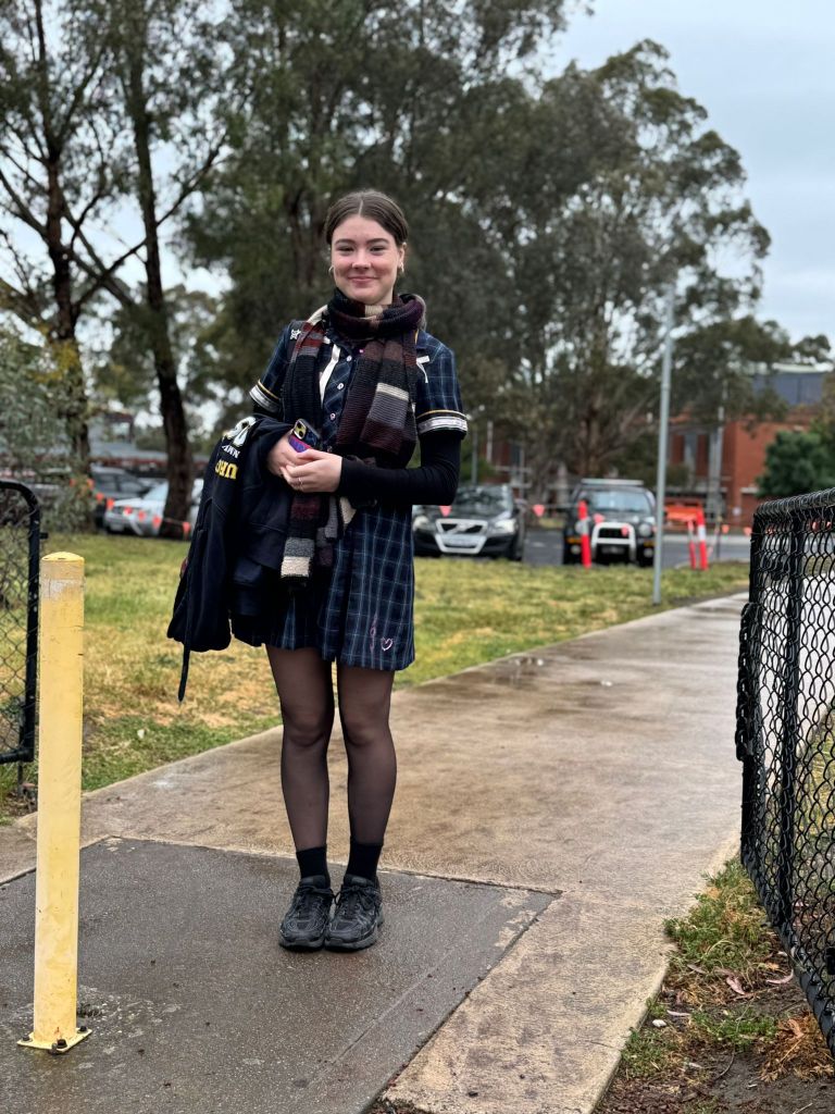 A young girl with curly hair, wearing a checkered school uniform, smiles at the camera while sitting in a colorful room with art supplies and family photos in the background.