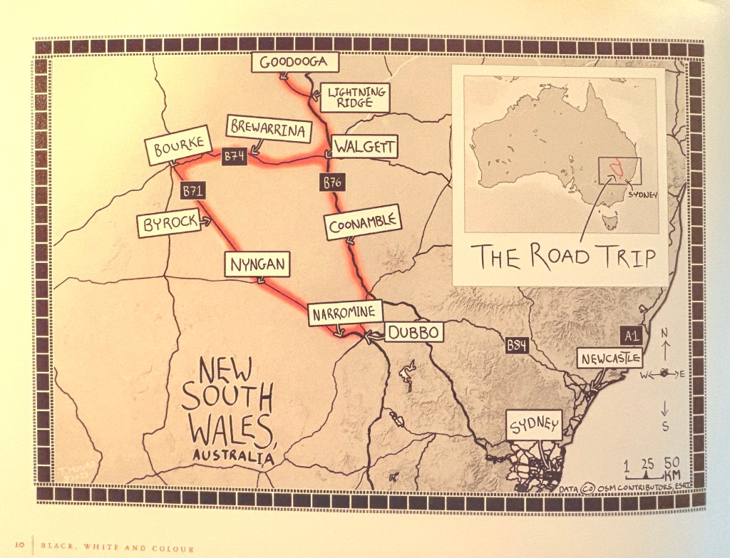 This is the map from the book which describes the road trip Tim and Merv took together to help prepare it, revisiting old stamping grounds and relations, the sites of some of his photographs, RSL and Bowling Clubs — landmarks of north-western NSW, a very special, interesting and not much visited part of Australia. The grey nomads pull in at Goodooga’s springs and might buy an opal or two at The Ridge, but they’ll whip past the steel shutters of Walgett and not spend too much time at Bourke. Byrock’s population is 50. Maybe. It used to be the case that one of them would be a teacher.