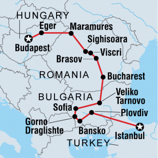 A full tilt Romanian evening meal is likely to consist of soup (phonetically ‘chorb’ or ‘chorb-uh’ everywhere in the eastern Balkans and Turkey) often vegetal, salad (anything up to 10 or 12 on a restaurant menu, variations on a theme, with shepherd’s salad the heartiest with corn, cheese and nuts), stew (the Hungarians do not have a mortgage on goulash), cake and fruit. Polenta in various forms appeared as an option at most meals. Cheese was a staple. At one hotel where we had breakfast I counted 14 different types. Snacks come out of the street windows: a score of different types of pretzels, and layers of filo, rolled or flat, filled with cheese or fruit. Shops selling gyros (the meat we get in souvlaki) were everywhere. Breakfast was bread (often home made), hard and soft cheese, excellent yoghurt, tomatoes and peppers — and when I say tomatoes and peppers, I mean tomatoes and peppers straight out of the garden such as you have never tasted. Four of our five local guides commented on the exodus of young people from country regions. Each of them, remarkably, used the image of there being no one left to tend the tomatoes to describe the calamity that was in the offing.
